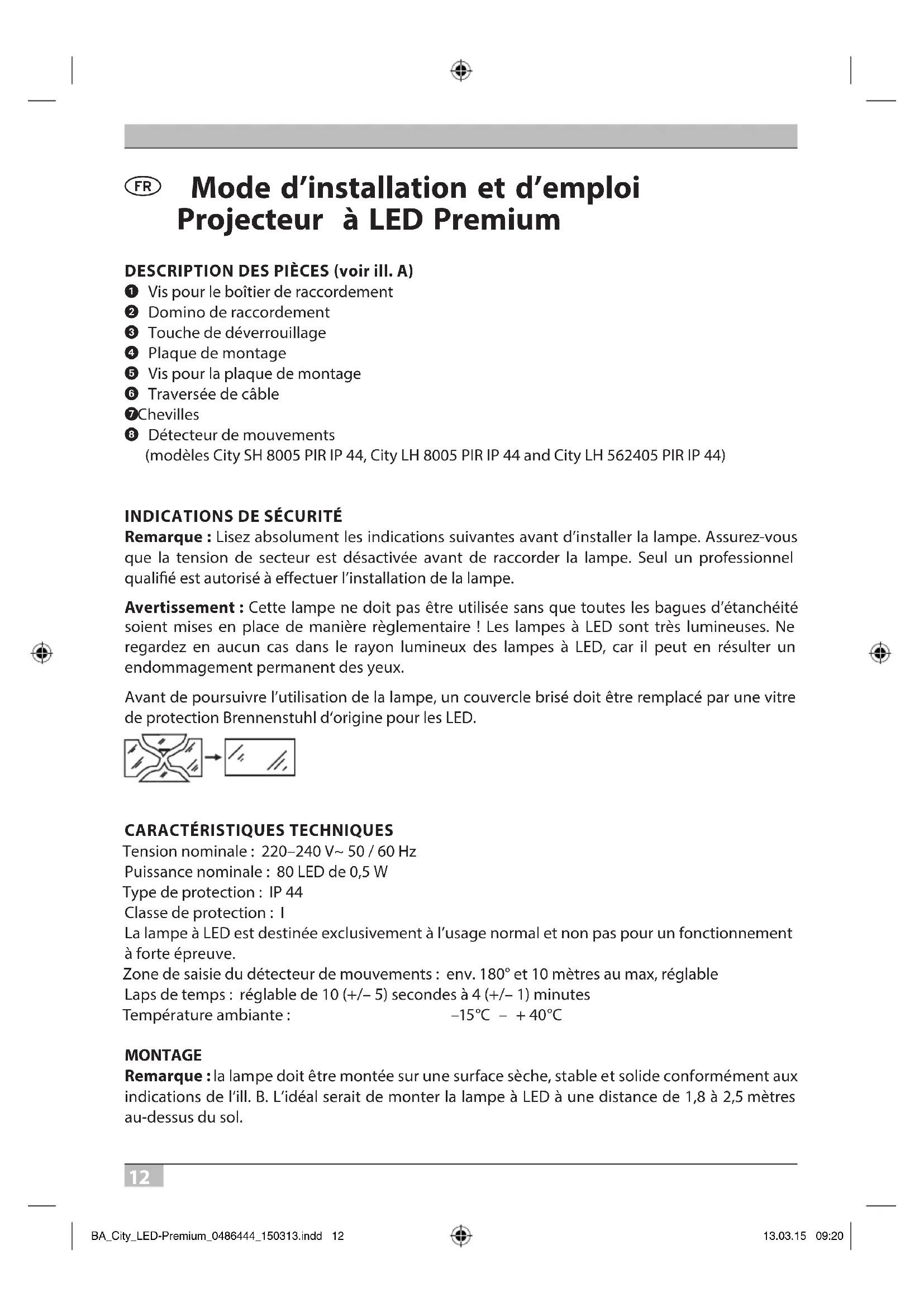 ou de surfaces avec eet rééchissant. Orienter à nouveau le détecteur de mouvements. Remarque : Tous les appareils dotés d’un capteur PIR réagissent avec une plus grande sensibilité dans des conditions météorologiques froides que par temps chaud. FABRICANT Hugo Brennenstuhl GmbH & Co. KG Seestraße 1 – 3 ∙ D-72074 Tübingen H. Brennenstuhl S.A.S. 4 rue de Bruxelles · F-67170 Bernolsheim lectra-t ag Blegistrasse 13 ∙ CH-6340 Baar www.brennenstuhl.com BA_City_LED-Premium_0486444_150313.indd 15 13.03.15 09:2016