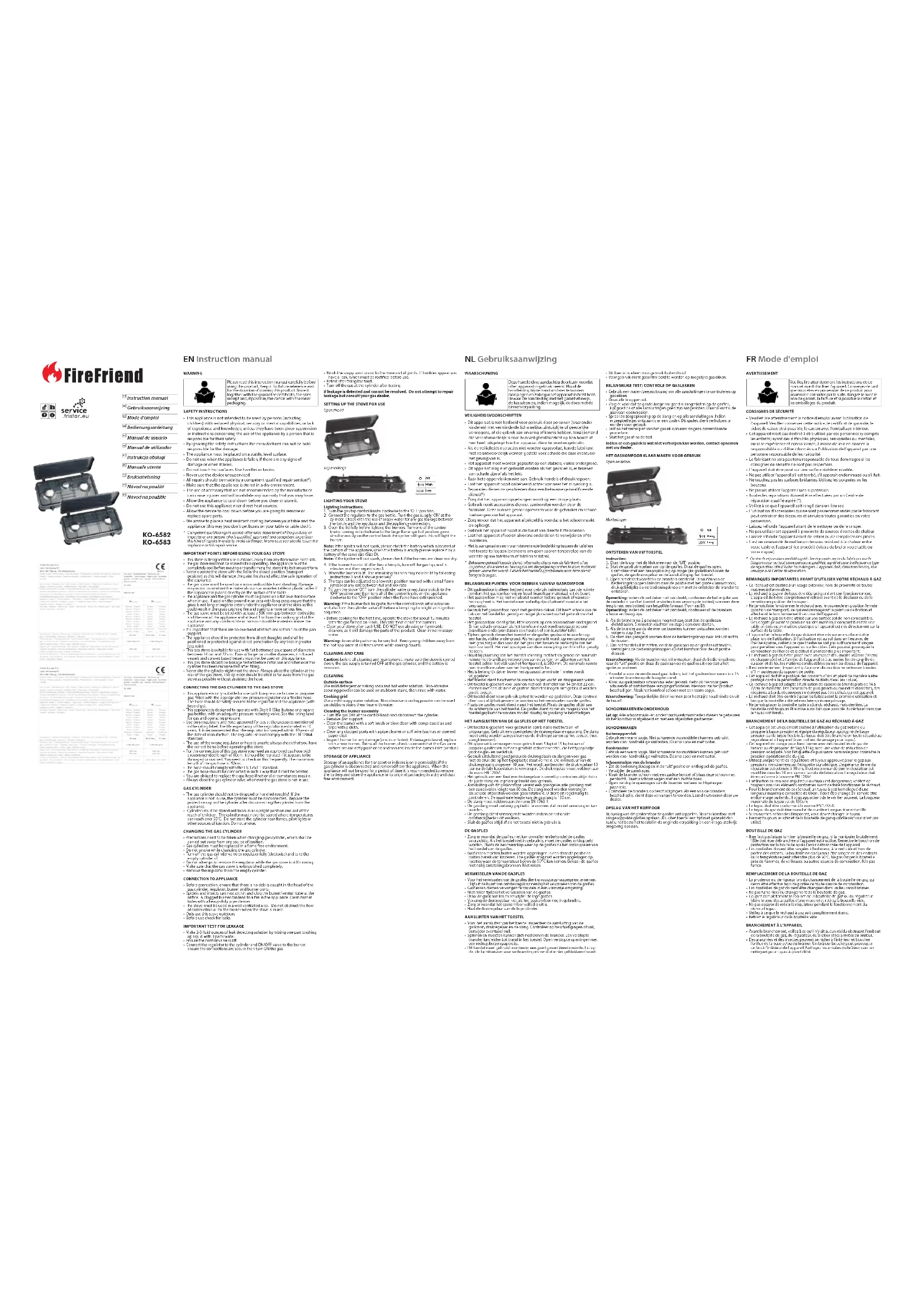- Connect the regulator to the cylinder and ON/OFF valve to the burner, ensure the connections are secure then turn ON the gas. EN Instruction manual NL Gebruiksaanwijzing FR Mode d'emploi AVERTISSEMENT Veuillez lire attentivement les instructions de ce manuel avant d'utiliser l’appareil. Conservez-le tant que vous êtes en possession de ce produit pour pourvoir le consulter par la suite. Rangez-le avec le bon de garanti, la facture et si possible le carton et les emballages du produit.