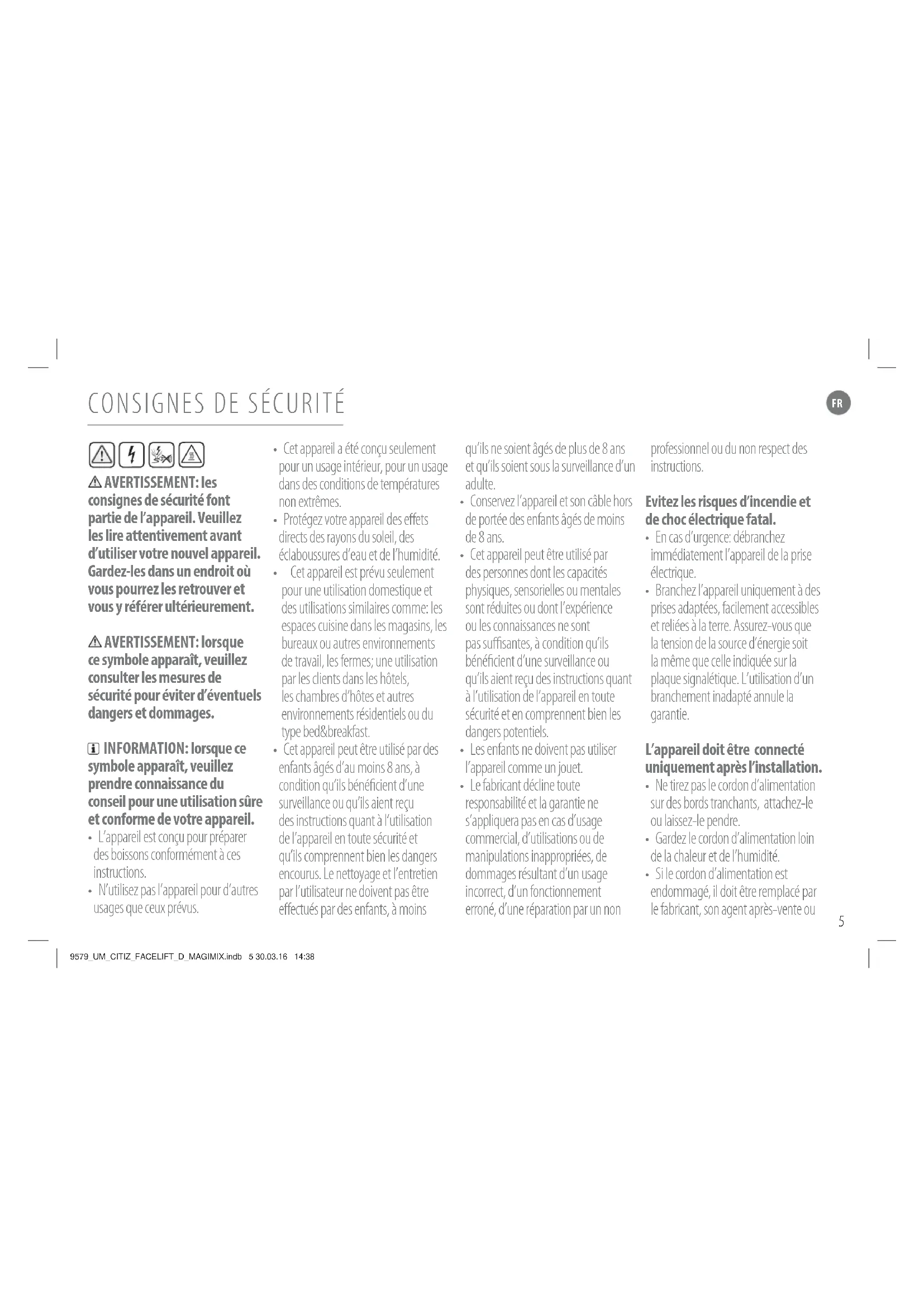 Cups Tasses (40 ml) 9579_UM_CITIZ_FACELIFT_D_MAGIMIX.indb 16 30.03.16 14:38ATTENTION Risque d’électrocution mortelle et d’incendie. Ne plongez jamais l’appareil ou une partie de celui-ci dans l’eau. Assurez-vous d’avoir débranché la machine avant de la nettoyer. Ne pas utiliser de détergent fort ou solvant. Ne pas utiliser d’objets tranchants, des brosses ou abrasifs tranchants. Ne placez pas dans un lave-vaisselle. Nettoyez la sortie du café régulièrement avec un chion doux et humide. L’unité de maintenance peut être retirée en pièces détachées pour un nettoyage facile. NETTOYAGE WARNING Risk of fatal elec trical shock and re. Never immerse the appliance or part of it in water. Be sure to unplug the machine before cleaning. %POPUVTFBOZTUSPOHDMFBOJOHBHFOUPSTPMWFOUDMFBOFS %POPUVTFTIBSQPCKFDUTCSVTIFTPSTIBSQBCSBTJWFT %POPUQMBDFJOBEJTIXBTIFS Clean the coee outlet regularly with a soft damp cloth. Maintenance unit can be removed in separate pieces for easy cleaning. CLEANING/