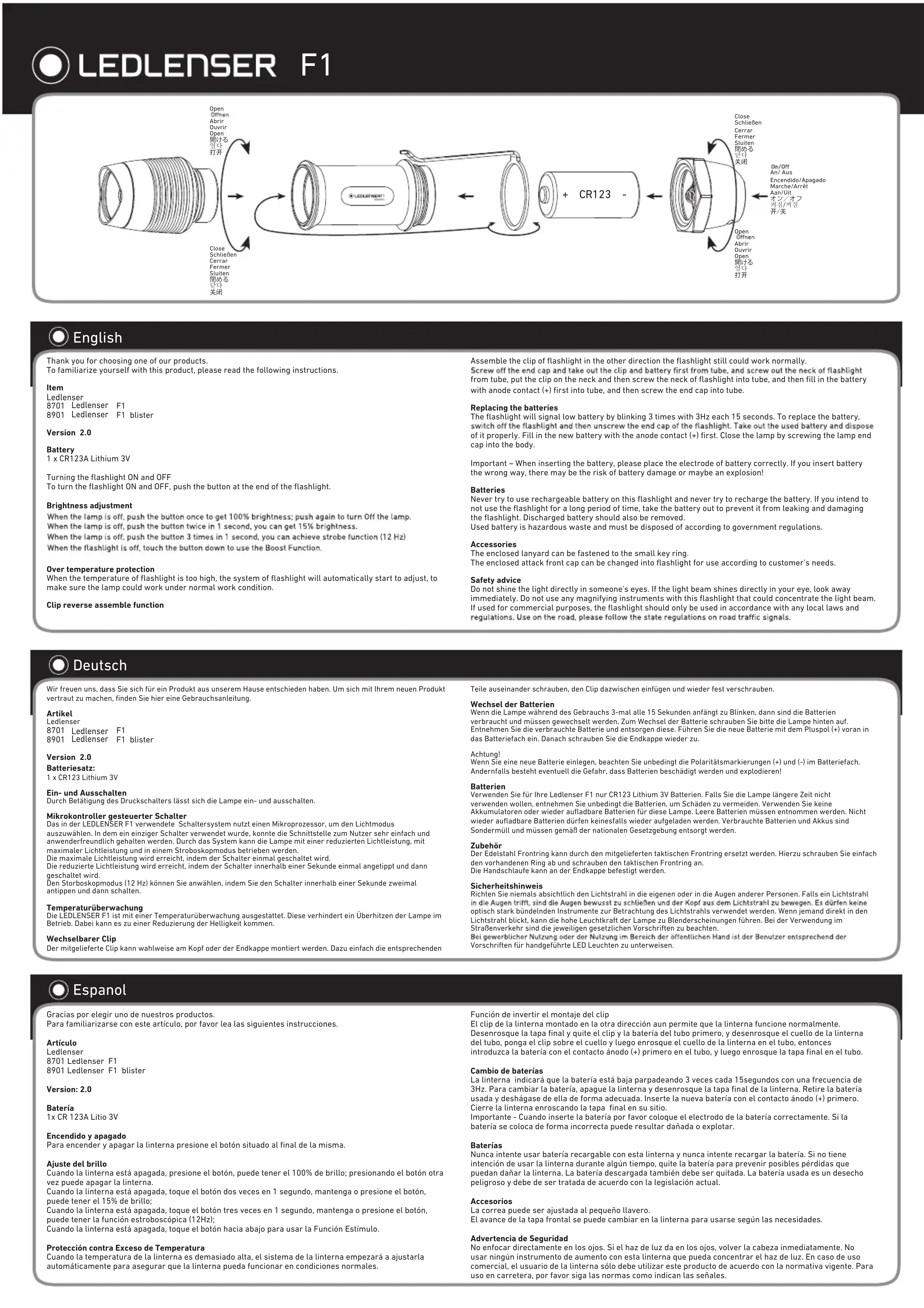 Pour voite Leclien F1, veuillez n'utiliser que des piles lithium CR123 de 3 V. Si vous ne utilisez pas la lampe pendant une période prolongée, enlevez impérativement les piles pour éviter tout dommage. N'utilisez pas d'accumulateurs ou de piles rechargeables pour cette lampe. Les piles déchargées doivent être retirées du produit. Des piles non rechangeables ne doit en aucun cas être rechangées. Les piles et les batteries usagées constituent des déchets spéciaux doivent être éliminés conformément à la législation nationale.