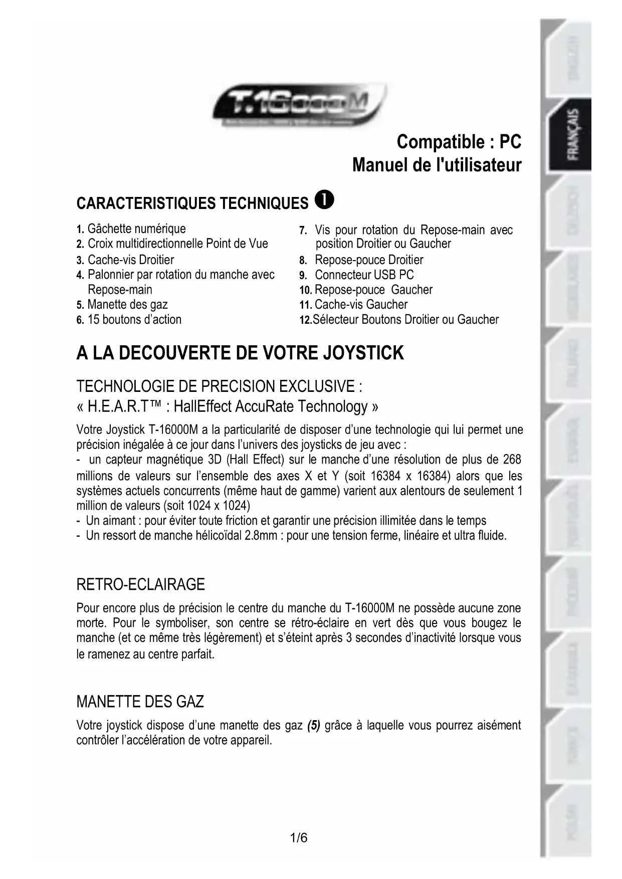 TECHNOLOGIE DE PRECISION EXCLUSIVE : « H.E.A.R.T™ : HallEffect AccuRate Technology » Votre Joystick T-16000M a la particularité de disposer d’une technologie qui lui permet une précision inégalée à ce jour dans l’univers des joysticks de jeu avec : - un capteur magnétique 3D (Hall Effect) sur le manche d’une résolution de plus de 268 millions de valeurs sur l’ensemble des axes X et Y (soit 16384 x 16384) alors que les systèmes actuels concurrents (même haut de gamme) varient aux alentours de seulement 1 million de valeurs (soit 1024 x 1024) - Un aimant : pour éviter toute friction et garantir une précision illimitée dans le temps - Un ressort de manche hélicoïdal 2.8mm : pour une tension ferme, linéaire et ultra fluide.