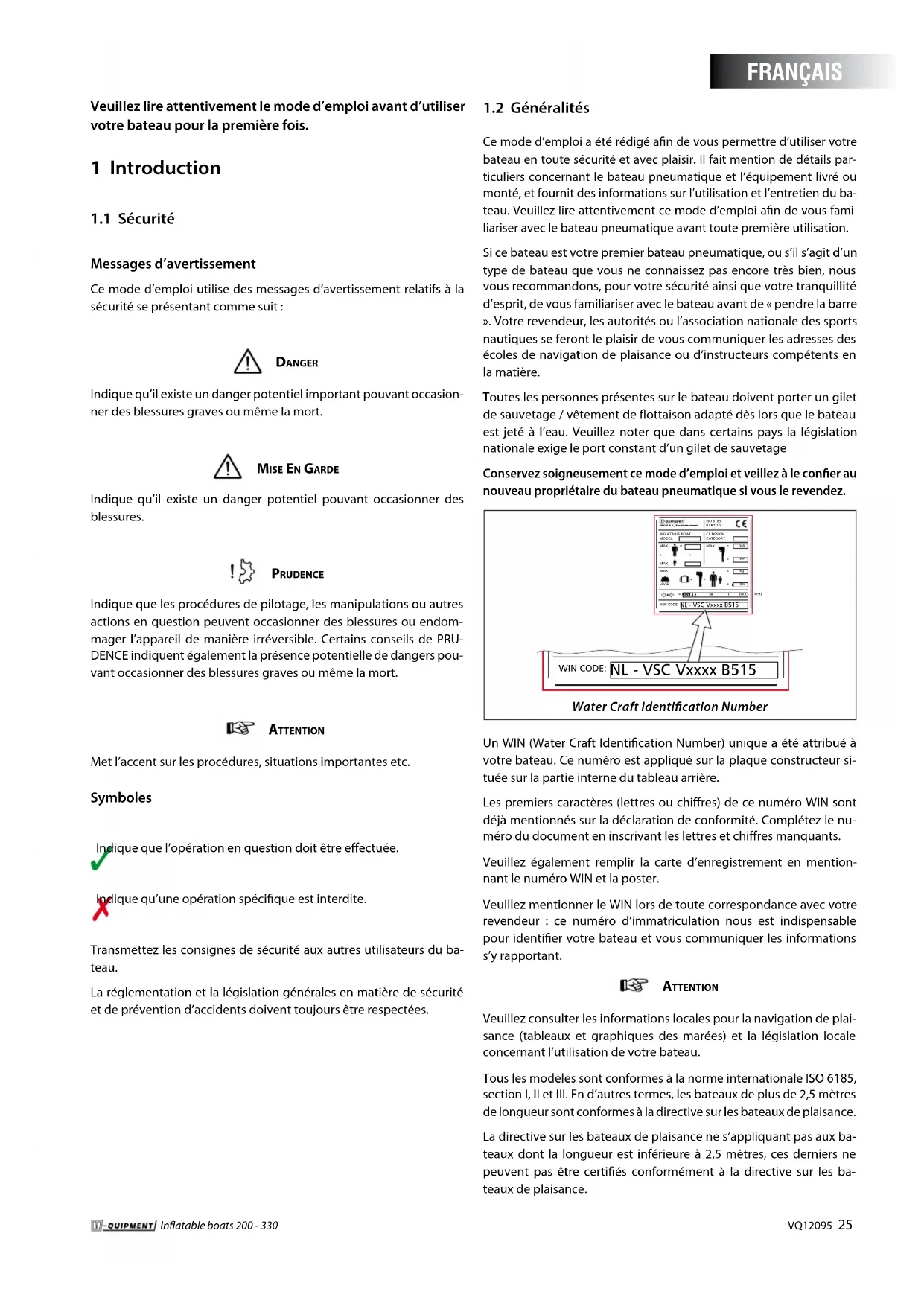 Dénitions C. Un bateau de la catégorie de conception C est considéré comme conçu pour des vents pouvant aller jusqu’à la force 6 comprise et des vagues pouvant atteindre une hauteur signicative jusqu’à 2 mètres compris.D. Un bateau de la catégorie de conception D est considéré comme conçu pour des vents pouvant aller jusqu’à la force 4 comprise et des vagues pouvant atteindre une hauteur signicative jusqu’à 0,3 mètre compris, avec des vagues occasionnelles d’une hauteur maximale de 0,5 mètre.Les bateaux de chaque catégorie de conception doivent être conçus et construits pour résister à ces paramètres en ce qui concerne la sta-bilité, la ottabilité et les autres exigences essentielles pertinentes énoncées dans la présente annexe et pour avoir de bonnes caracté-ristiques de manœuvrabilité. attention Utilisez le bateau uniquement si la force du vent et la hauteur des vagues prévues sont inférieures à celles mentionnées dans les dé-nitions ci-dessus. Veillez à ce que vous et votre équipage puissiez garder le contrôle même dans les conditions les moins favorables.VQ12095 27 Inatable boats 200 - 330 Accessoires standards (non illustrés) - Kit de réparation - Sac de transport - Pompe à pied 3 Utilisation du bateau