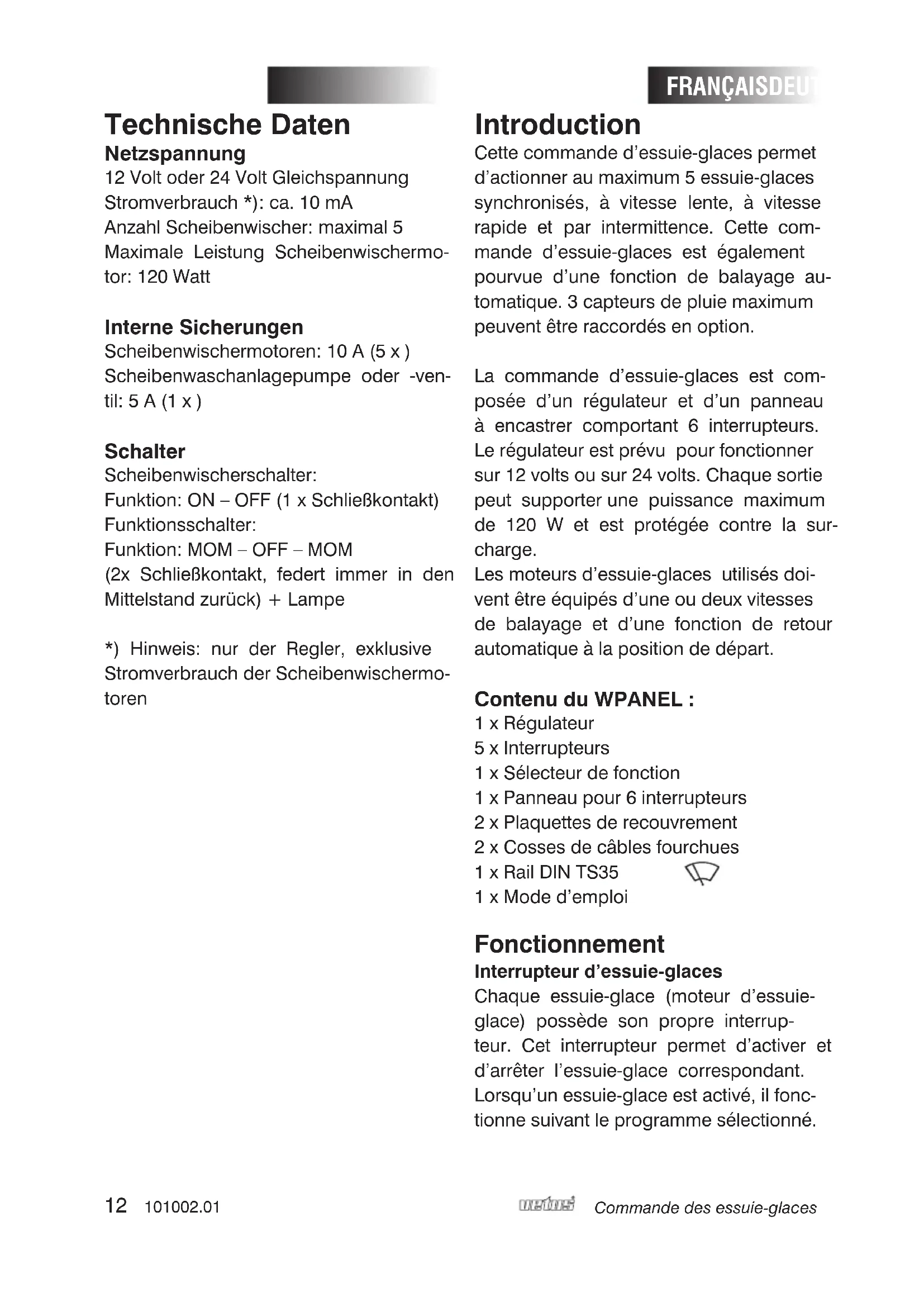 STATUS101002.01 11 Scheibenwischerbedienung DEUTSCH Unter Berücksichtigung des höchst- zulässigen Gesamtstroms der 5 Schei- benwischermotoren kann eventuell eine kleinere Sicherung eingebaut werden. Anschlusskabel mit ausreichend großem Durchmesser verwenden. Den Schaltplan für den empfohlenen Mindestkabeldurch- schnitt zu Rate ziehen. Die Netzspannung an die mitgelieferten Kabelklemmen (ø 5 mm) anschließen. Scheibenwischermotoren Ausschließlich Scheibenwischer- motoren des gleichen Typs einset- zen, die darüber hinaus mit einem automatischen Parkstand ausge- stattet sind. Um sowohl die niedrige als auch die hohe Geschwindigkeit nutzen zu können, müs- sen die eingesetzten Scheibenwischer- motoren 2 Geschwindigkeiten besitzen. Wie beispielsweise die Vetus-Typen RWS und HDMC. Der Vetus-Typ ORW ist nicht geeignet. Die Scheibenwischermotoren gemäß Schaltplan an den Regler anschließen. Anschlusskabel mit ausreichend großem Durchmesser verwenden. Den Schaltplan für den empfohlenen Kabeldurchschnitt auf Seite 24 zu Rate ziehen. Schalter Die Schalter gemäß Schaltplan an den Regler anschließen. Anschlusskabel mit ausreichend großem Durchmesser ver- wenden. Scheibenwaschanlage Für eine Scheibenwaschanlage kann am Anschluss „WASHER“ eine Wasserpumpe oder ein Magnetventil angeschlossen wer- den. Die Spannung für die Wasser- pumpe oder das Magnetventil muss der Bordspannung ent- sprechen (12 Volt oder 24 Volt). Regensensoren Für die Installation die bei den Regensen- soren mitgelieferte Gebrauchsanleitung zu Rate ziehen. Sicherungen Jeder Scheibenwischermotor ist mit einer separaten Sicherung gesichert. Auch die Sprüherpumpe verfügt über eine Siche- rung. Diese Sicherungen befinden sich unter dem Deckel des Reglers (zur Entfernung des Deckels siehe unten stehende Abbil- dung). Für die Spezifiktionen der Sicherungen siehe „Technische Daten“.12 101002.01 Commande des essuie-glaces Technische Daten Netzspannung 12 Volt oder 24 Volt Gleichspannung Stromverbrauch *): ca. 10 mA Anzahl Scheibenwischer: maximal 5 Maximale Leistung Scheibenwischermo- tor: 120 Watt Interne Sicherungen Scheibenwischermotoren: 10 A (5 x ) Scheibenwaschanlagepumpe oder -ven- til: 5 A (1 x ) Schalter Scheibenwischerschalter: Funktion: ON – OFF (1 x Schließkontakt) Funktionsschalter: Funktion: MOM – OFF – MOM (2x Schließkontakt, federt immer in den Mittelstand zurück) + Lampe *) Hinweis: nur der Regler, exklusive Stromverbrauch der Scheibenwischermo- toren Introduction Cette commande d’essuie-glaces permet d’actionner au maximum 5 essuie-glaces synchronisés, à vitesse lente, à vitesse rapide et par intermittence. Cette com- mande d’essuie-glaces est également pourvue d’une fonction de balayage au- tomatique. 3 capteurs de pluie maximum peuvent être raccordés en option. La commande d’essuie-glaces est com- posée d’un régulateur et d’un panneau à encastrer comportant 6 interrupteurs. Le régulateur est prévu pour fonctionner sur 12 volts ou sur 24 volts. Chaque sortie peut supporter une puissance maximum de 120 W et est protégée contre la sur- charge. Les moteurs d’essuie-glaces utilisés doi- vent être équipés d’une ou deux vitesses de balayage et d’une fonction de retour automatique à la position de départ. Contenu du WPANEL : 1 x Régulateur 5 x Interrupteurs 1 x Sélecteur de fonction 1 x Panneau pour 6 interrupteurs 2 x Plaquettes de recouvrement 2 x Cosses de câbles fourchues 1 x Rail DIN TS35 1 x Mode d’emploi Fonctionnement Interrupteur d’essuie-glaces Chaque essuie-glace (moteur d’essuie- glace) possède son propre interrup- teur. Cet interrupteur permet d’activer et d’arrêter l’essuie-glace correspondant. Lorsqu’un essuie-glace est activé, il fonc- tionne suivant le programme sélectionné. FRANÇAISDEUTSCH101002.01 13 Commande des essuie-glaces Sélecteur de fonction SPEED (vitesse) Chaque pression sur le sélecteur ‘SPEED’ sélectionne le programme de balayage suivant. Les différents programmes pro- posés : 1 intervalle de 11 sec, 2 intervalle de 9 sec, 3 intervalle de 7 sec, 4 intervalle de 5 sec, 5 intervalle de 3 sec, 6 vitesse lente continue, 7 vitesse rapide continue. Lorsque le programme 7 est atteint, ap- puyer sur l’interrupteur permet de resélec- tionner le programme 1. Si un autre pro- gramme est sélectionné, la lampe témoin émet une succession de clignotements (de 1 à 7 clignotements) pour indiquer le nouveau programme réglé ; la succession de clignotements est répétée une fois. Voir à la page 23 ‘Utilisation de la touche ‘SPEED’. Lors de la première utilisation, et après la mise hors-tension, les essuie-glaces fonc- tionnent à faible vitesse. Si la tension d’alimentation n’a pas été coupée, les essuie-glaces fonctionnent toujours à la dernière vitesse ou cadence réglées, à moins que la dernière posi- tion ne soit la plus grande vitesse. La commande automatique des moteurs d’essuie-glaces est possible si des cap- teurs de pluie ont été installés ; consultez le mode d’emploi fourni avec les capteurs de pluie. Interrupteur du lave-glace Appuyer une fois sur l’interrupteur pour exécuter automatiquement le programme complet : - active le lave-glace pendant 3 secondes - 3 balayages minimum avec lave-glace simultané, - 3 balayages. Maintenir l’interrupteur enfoncé pour actionner le balayage des essuie-glaces et le lave-glace simultanément. Tous les es- suie-glaces présents seront actionnés quelque soit la position de l’interrupteur des essuie-glaces ! Lampe témoin SPEED La lampe témoin du sélecteur de fonction indique l’état de la commande des essuie- glaces : Allumée : la commande des essuie-glaces est activée, Eteinte : la commande des essuie-glaces est désactivée, Clignote rapidement : La tension d’alimentation est trop faible ou une erreur interne s’est produite, Deux successions de clignotements : Af- fiche le programme sélectionné. S’aff