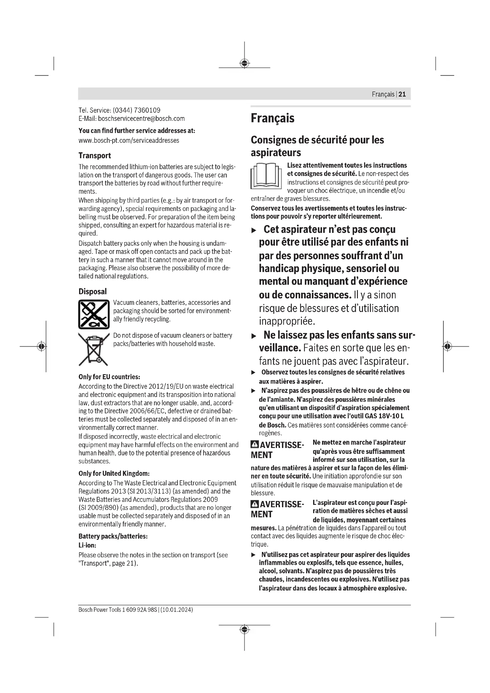 Replace the filter(33) if it is damaged. – Position the filter(33) over the filter bracket(35) and turn it as far as it will go in the direction of rotation . – Replace the dust extractor lid(5) and close the catches(2). Make sure that the catches engage firmly. Faults If the suction power is insufficient, check: – Is the container(1) full? ▷(see "Cleaning the container (see figures H1–H2)", page20). – Is the filter(33) clogged with dust? ▷(see "Cleaning/replacing filters (see figures I1–I2)", page20). – Is the battery capacity too weak? ▷Charge the rechargeable battery. Regularly emptying the container(1) and cleaning the filter(33) will ensure optimum suction power. If sufficient suction power is not achieved after following these steps, please contact aBosch-after-sales service centre. Storage (see figure J) – Insert the suction tubes (18) into the brackets (25). – Insert the crevice nozzle (16) into a suction tube (18). – Insert the floor nozzle (17) into the bracket (27). – Wind the vacuum hose (13) around the bracket (27) from below and fasten the retaining strap (36). – Only ever carry the dust extractor by the carrying handle (6) or by the carrying strap (if present). – Store the dust extractor in a dry room and secure it so that it cannot be used by unauthorised persons. After-Sales Service and Application Service Our after-sales service responds to your questions concern- ing maintenance and repair of your product as well as spare parts. You can find explosion drawings and information on spare parts at: www.bosch-pt.com The Bosch product use advice team will be happy to help you with any questions about our products and their accessor- ies. In all correspondence and spare parts orders, please always include the 10‑digit article number given on the nameplate of the product. Great Britain Robert Bosch Ltd. (B.S.C.) P.O. Box 98 Broadwater Park North Orbital Road Denham Uxbridge UB 9 5HJ At www.bosch-pt.co.uk you can order spare parts or arrange the collection of a product in need of servicing or repair. 1 609 92A 98S | (10.01.2024) Bosch Power ToolsFrançais | 21 Tel. Service: (0344) 7360109 E-Mail: boschservicecentre@bosch.com You can find further service addresses at: www.bosch-pt.com/serviceaddresses Transport The recommended lithium-ion batteries are subject to legis- lation on the transport of dangerous goods. The user can transport the batteries by road without further require- ments. When shipping by third parties (e.g.: by air transport or for- warding agency), special requirements on packaging and la- belling must be observed. For preparation of the item being shipped, consulting an expert for hazardous material is re- quired. Dispatch battery packs only when the housing is undam- aged. Tape or mask off open contacts and pack up the bat- tery in such a manner that it cannot move around in the packaging. Please also observe the possibility of more de- tailed national regulations. Disposal Vacuum cleaners, batteries, accessories and packaging should be sorted for environment- ally friendly recycling. Do not dispose of vacuum cleaners or battery packs/batteries with household waste. Only for EU countries: According to the Directive 2012/19/EU on waste electrical and electronic equipment and its transposition into national law, dust extractors that are no longer usable, and, accord- ing to the Directive 2006/66/EC, defective or drained bat- teries must be collected separately and disposed of in an en- vironmentally correct manner. If disposed incorrectly, waste electrical and electronic equipment may have harmful effects on the environment and human health, due to the potential presence of hazardous substances. Only for United Kingdom: According to The Waste Electrical and Electronic Equipment Regulations 2013 (SI2013/3113) (as amended) and the Waste Batteries and Accumulators Regulations 2009 (SI2009/890) (as amended), products that are no longer usable must be collected separately and disposed of in an environmentally friendly manner. Battery packs/batteries: Li-ion: Please observe the notes in the section on transport (see "Transport", page21). Français Consignes de sécurité pour les aspirateurs Lisez attentivement toutes les instructions et consignes de sécurité. Le non-respect des instructions et consignes de sécurité peut pro- voquer un choc électrique, un incendie et/ou entraîner de graves blessures. Conservez tous les avertissements et toutes les instruc- tions pour pouvoir s’y reporter ultérieurement. u Cet aspirateur n’est pas conçu pour être utilisé par des enfants ni par des personnes souffrant d’un handicap physique, sensoriel ou mental ou manquant d’expérience ou de connaissances. Il y a sinon risque de blessures et d’utilisation inappropriée. u Ne laissez pas les enfants sans sur- veillance. Faites en sorte que les en- fants ne jouent pas avec l’aspirateur. u Observez toutes les consignes de sécurité relatives aux matières à aspirer. u N’aspirez pas des poussières de hêtre ou de chêne ou de l’amiante. N’aspirez des poussières minérales qu’en utilisant un dispositif d’aspiration spécialement conçu pour une utilisation avec l'outilGAS 18V-10 L deBosch. Ces matières sont considérées comme cancé- rogènes. AVERTISSE- MENT Ne mettez en marche l’aspirateur qu’après vous être suffisamment informé sur son utilisation, sur la nature des matières à aspirer et sur la façon de les élimi- ner en toute sécurité. Une initiation approfondie sur son utilisation réduit le risque de mauvaise manipulation et de blessure. AVERTISSE- MENT L’aspirateur est conçu pour l’aspi- ration de matières sèches et aussi de liquides, moyennant certaines mesures. La pénétration de liquides dans l’appareil ou tout contact avec des liquides augmente le risque de choc élec- trique. u N’utilisez pas cet aspirateur pour aspirer des liquides inflammables ou explosifs, tels que essence, huil