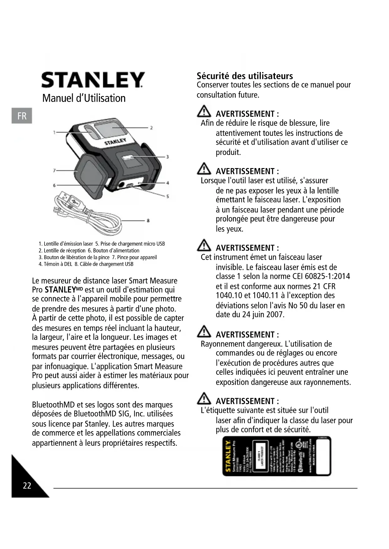 est un outil d'estimation qui se connecte à l'appareil mobile pour permettre de prendre des mesures à partir d'une photo. À partir de cette photo, il est possible de capter des mesures en temps réel incluant la hauteur, la largeur, l'aire et la longueur. Les images et mesures peuvent être partagées en plusieurs formats par courrier électronique, messages, ou par infonuagique. L'application Smart Measure Pro peut aussi aider à estimer les matériaux pour plusieurs applications différentes. BluetoothMD et ses logos sont des marques déposées de BluetoothMD SIG, Inc. utilisées sous licence par Stanley. Les autres marques de commerce et les appellations commerciales appartiennent à leurs propriétaires respectifs. Sécurité des utilisateurs Conserver toutes les sections de ce manuel pour consultation future.