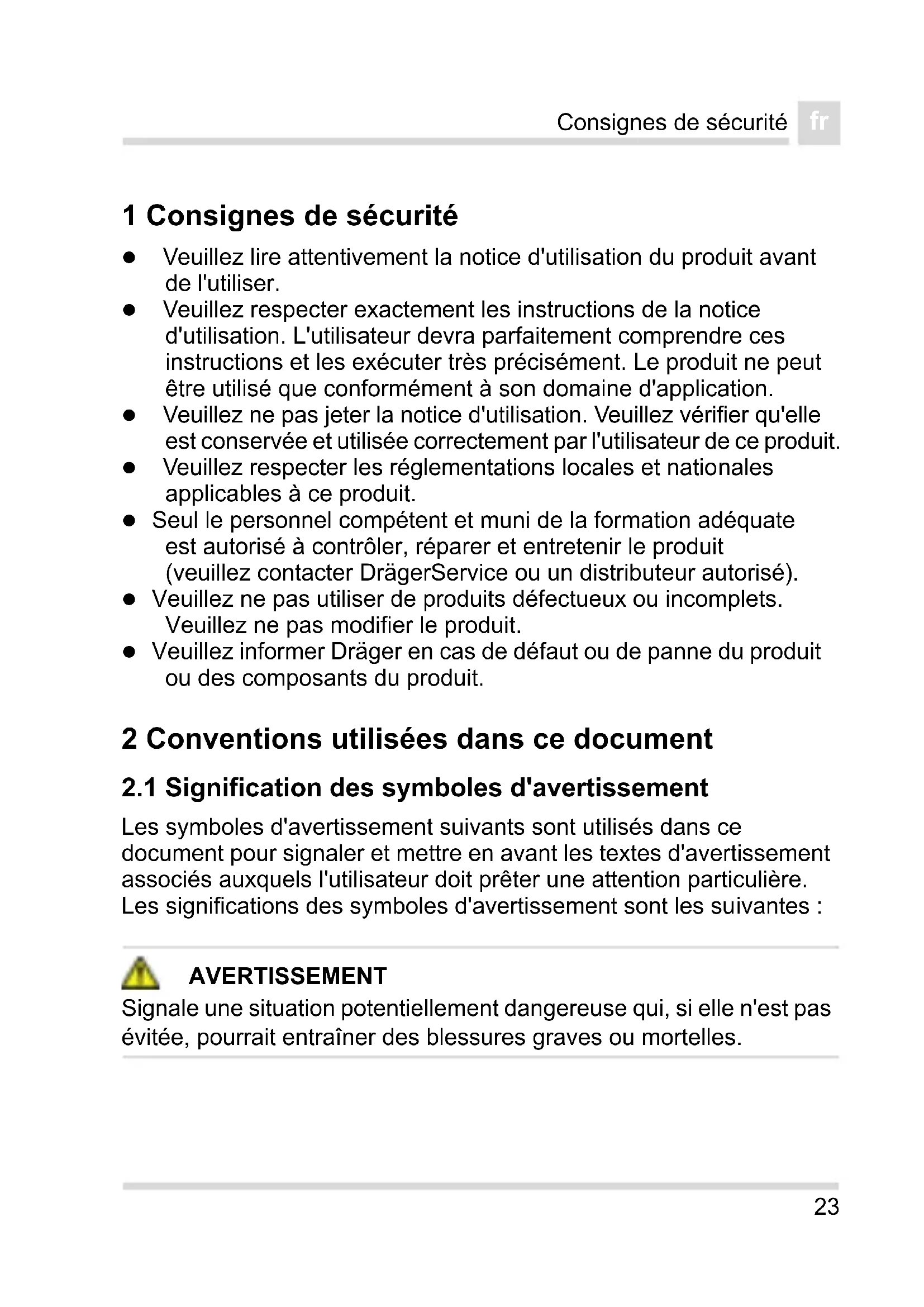 1 Consignes de sécurité Veuillez lire attentivement la notice d'utilisation du produit avant de l'utiliser. Veuillez respecter exactement les instructions de la notice d'utilisation. L'utilisateur devra parfaitement comprendre ces instructions et les exécuter très précisément. Le produit ne peut être utilisé que conformément à son domaine d'application. Veuillez ne pas jeter la notice d'utilisation. Veuillez vérifier qu'elle est conservée et utilisée correctement par l'utilisateur de ce produit. Veuillez respecter les réglementations locales et nationales applicables à ce produit. Seul le personnel compétent et muni de la formation adéquate est autorisé à contrôler, réparer et entretenir le produit (veuillez contacter DrägerService ou un distributeur autorisé). Veuillez ne pas utiliser de produits défectueux ou incomplets. Veuillez ne pas modifier le produit. Veuillez informer Dräger en cas de défaut ou de panne du produit ou des composants du produit. 2 Conventions utilisées dans ce document