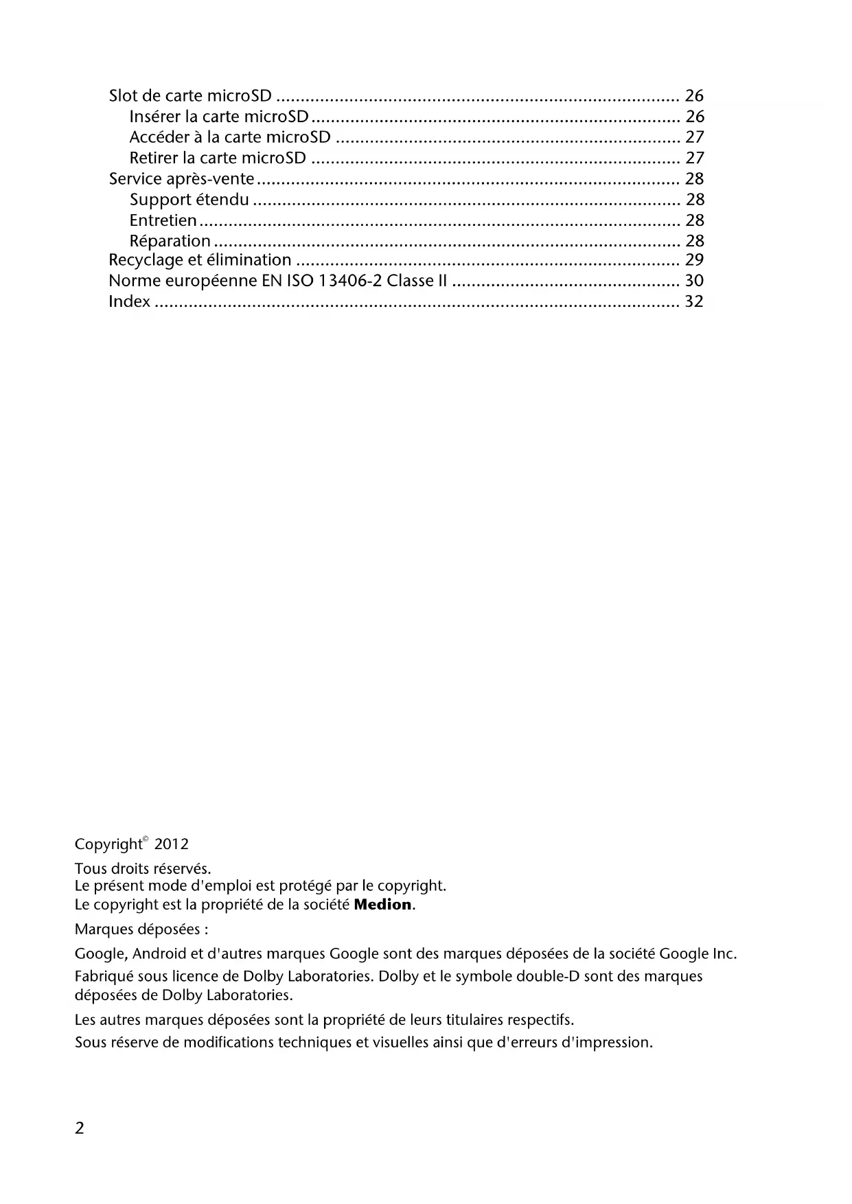 Tous droits réservés. Le présent mode d'emploi est protégé par le copyright. Le copyright est la propriété de la société Medion. Marques déposées : Google, Android et d'autres marques Google sont des marques déposées de la société Google Inc. Fabriqué sous licence de Dolby Laboratories. Dolby et le symbole double-D sont des marques déposées de Dolby Laboratories. Les autres marques déposées sont la propriété de leurs titulaires respectifs. Sous réserve de modifications techniques et visuelles ainsi que d'erreurs d'impression.3 Français Nederlands Deutsch Dansk English Utilisation conforme Votre tablette PC vous offre des possibilités d’utilisation variées : vous pouvez par exemple surfer partout et à tout moment sur Internet, lire messages et livres, savourer jeux et films ainsi que communiquer avec le monde entier. L’appareil est destiné uniquement à un usage privé et non industriel/commercial. Veuillez noter qu’en cas d’utilisation non conforme, la garantie est annulée : Ne transformez pas l’appareil sans notre accord et n’utilisez pas d’autres périphériques que ceux que nous avons autorisés ou livrés. Utilisez uniquement des pièces de rechange et accessoires que nous avons livrés ou autorisés. Tenez compte de toutes les informations contenues dans ce mode d’emploi, en particulier des consignes de sécurité. Toute autre utilisation est considérée comme non conforme et peut entraîner des dommages corporels ou matériels. N’utilisez pas l’appareil dans des conditions ambiantes extrêmes. Attention ! La bande avec la mention LIFETAB® n'est pas un film protecteur, mais fait partie du design de l'appareil. N'enlevez en aucun cas la bande argentée pour éviter toute trace de colle ou rayure sur le boîtier de l'appareil.4 Informations relatives à la conformité La tablette PC est livrée avec les équipements radio suivants : Wi-Fi Bluetooth