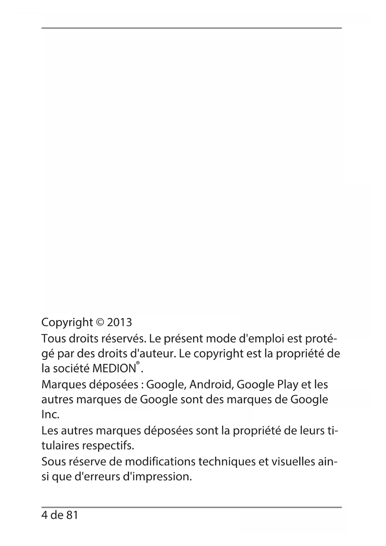 E7316 FR Generic Final Content.indd 3E7316 FR Generic Final Content.indd 3 31.10.2013 15:50:1631.10.2013 15:50:164 de 81 Copyright © 2013 Tous droits réservés. Le présent mode d'emploi est proté- gé par des droits d'auteur. Le copyright est la propriété de la société MEDION