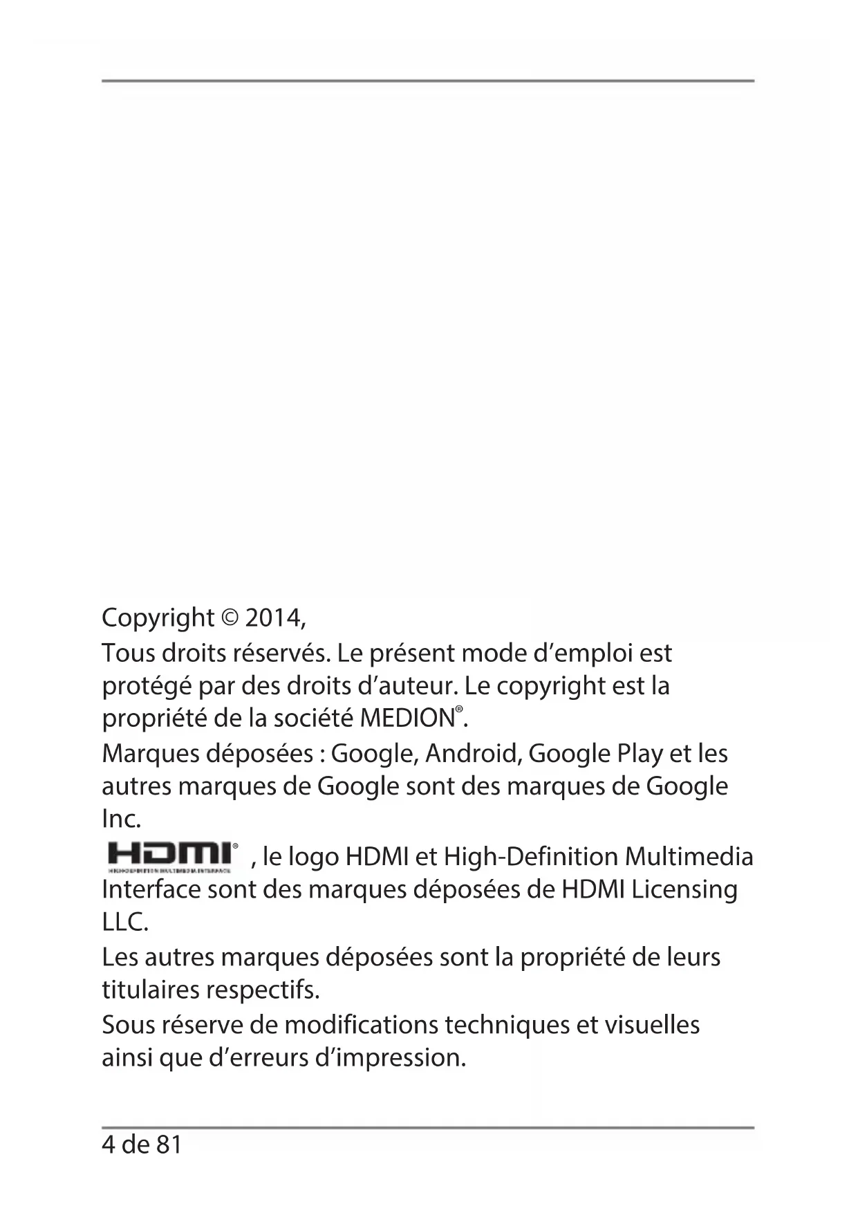 S1033X FR Generic RC1 Content.indd 3S1033X FR Generic RC1 Content.indd 3 18.07.2014 10:08:1018.07.2014 10:08:104 de 81 Copyright © 2014, Tous droits réservés. Le présent mode d’emploi est protégé par des droits d’auteur. Le copyright est la propriété de la société MEDION