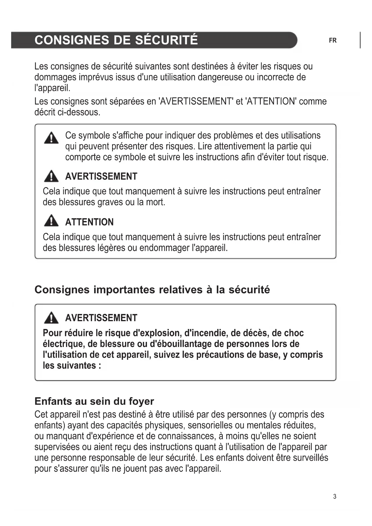 Les consignes de sécurité suivantes sont destinées à éviter les risques ou dommages imprévus issus d'une utilisation dangereuse ou incorrecte de l'appareil. Les consignes sont séparées en 'AVERTISSEMENT' et 'ATTENTION' comme décrit ci-dessous. Ce symbole s'affiche pour indiquer des problèmes et des utilisations qui peuvent présenter des risques. Lire attentivement la partie qui comporte ce symbole et suivre les instructions afin d'éviter tout risque. AVERTISSEMENT Cela indique que tout manquement à suivre les instructions peut entraîner des blessures graves ou la mort. ATTENTION Cela indique que tout manquement à suivre les instructions peut entraîner des blessures légères ou endommager l'appareil. Consignes importantes relatives à la sécurité AVERTISSEMENT Pour réduire le risque d'explosion, d'incendie, de décès, de choc électrique, de blessure ou d'ébouillantage de personnes lors de l'utilisation de cet appareil, suivez les précautions de base, y compris les suivantes : Enfants au sein du foyer Cet appareil n'est pas destiné à être utilisé par des personnes (y compris des enfants) ayant des capacités physiques, sensorielles ou mentales réduites, ou manquant d'expérience et de connaissances, à moins qu'elles ne soient supervisées ou aient reçu des instructions quant à l'utilisation de l'appareil par une personne responsable de leur sécurité. Les enfants doivent être surveillés pour s'assurer qu'ils ne jouent pas avec l'appareil.4
