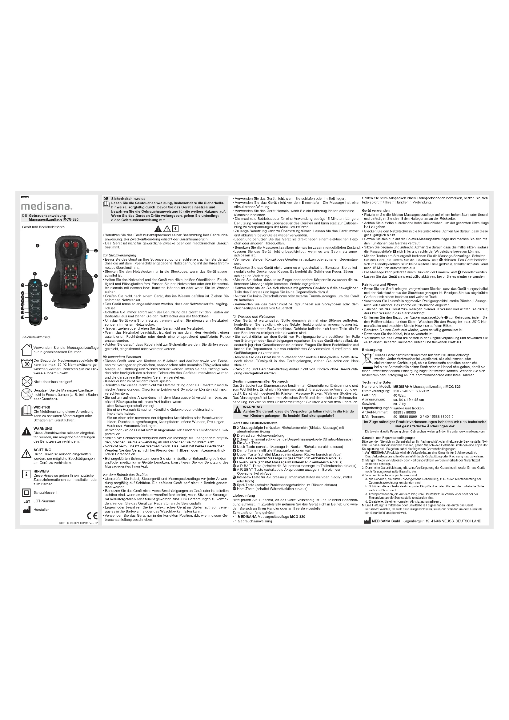 88991_95 MCG820 08/2019 Ver. 1.2Utilisez le matelas de massage pour siège uniquement dans des pièces fer- mées ! La housse des têtes de massage pour la nuque