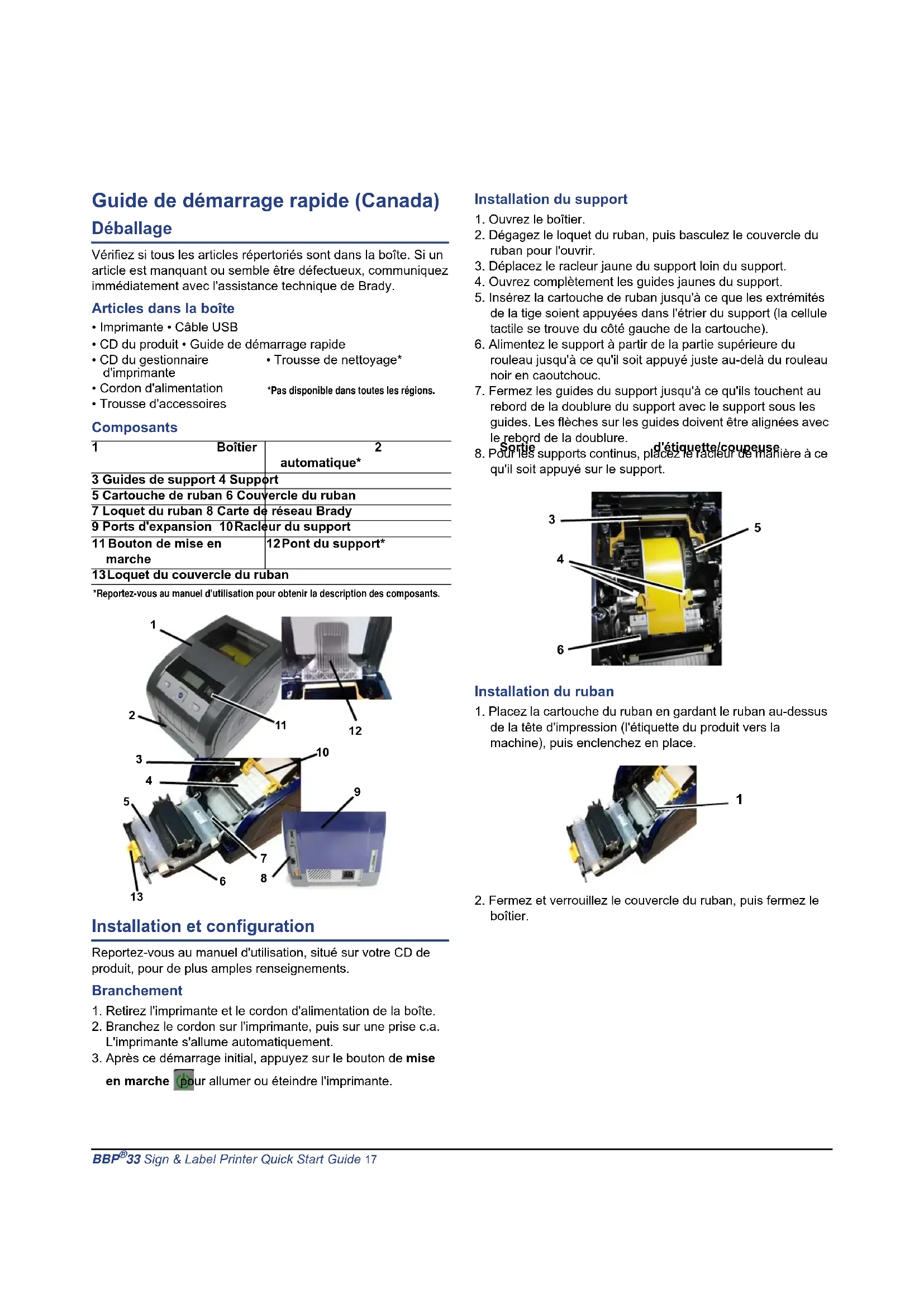 33 Sign & Label Printer Quick Start Guide 17 Guide de démarrage rapide (Canada) Déballage Vérifiez si tous les articles répertoriés sont dans la boîte. Si un article est manquant ou semble être défectueux, communiquez immédiatement avec l'assistance technique de Brady. Articles dans la boîte Composants Installation et configuration Reportez-vous au manuel d'utilisation, situé sur votre CD de produit, pour de plus amples renseignements. Branchement