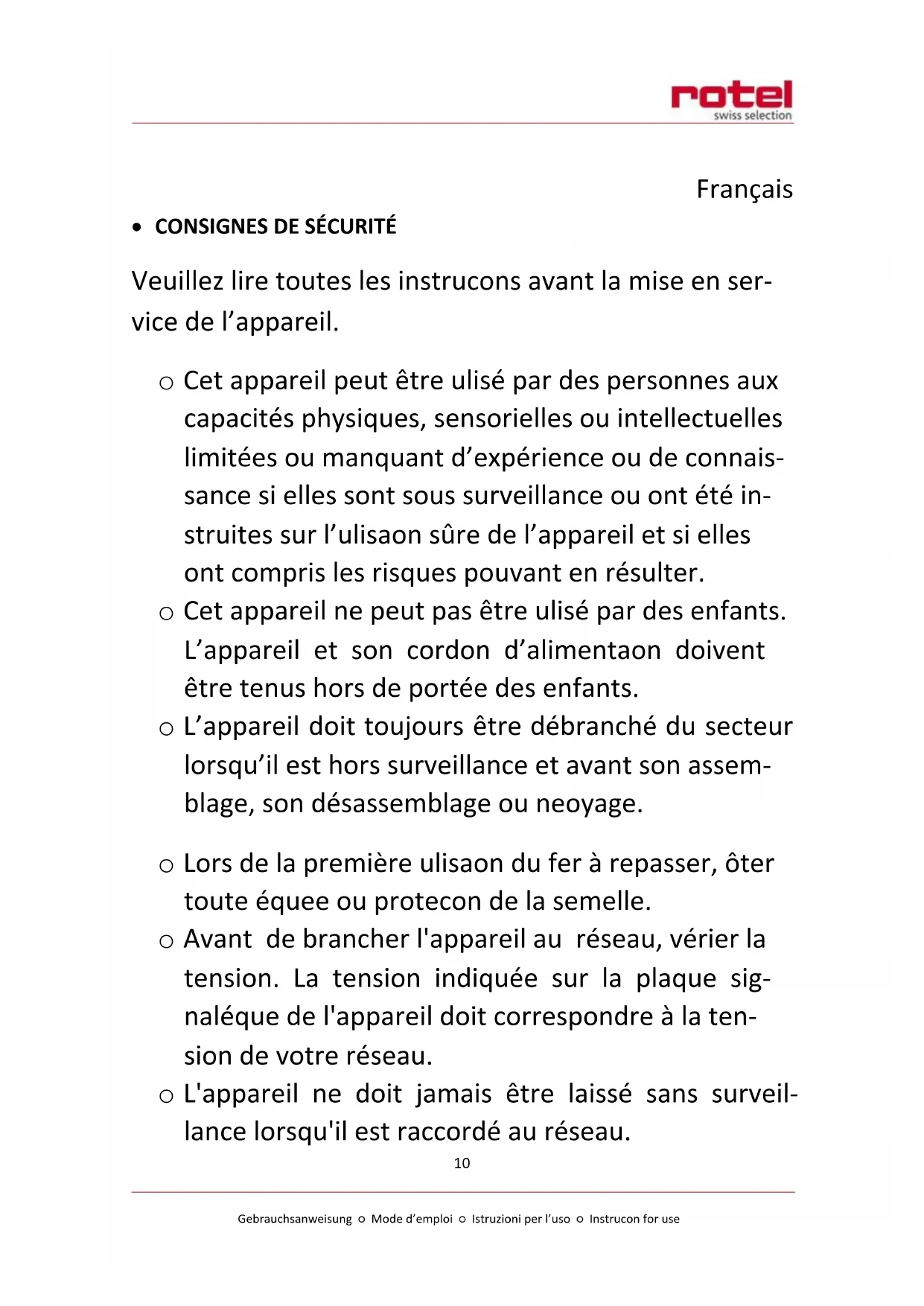 o Lorsque le fer à repasser est chaud, il ne doit jamais être posé sur le cordon ou sur le cordon d'alimenta- tion; faire très attention à ce que ce cordon n'entre jamais en contact avec la semelle chaude du fer à repasser. o Lors de la première utilisation du fer à repasser, il se peut qu'il produise un peu de fumée et d'eau: c'est un phénomène parfaitement normal qui disparaîtra après quelques minutes. o Il se peut qu'il y ait à l'intérieur du réservoir de votre fer à repasser des traces de condensation ou des gouttelettes d'eau. Ce phénomène est tout à fait normal et il est dû à un contrôle de qualité rig- oureux, effectué sur tous nos fers à repasser avant leur mise en vente. o Ne jamais verser du vinaigre ou toute autre sub- stance détartrante dans le réservoir. o En cas de défauts ou de cordon électrique défec- tueux, faire parvenir l'appareil à un spécialiste ou au service après-vente de Rotel. o La maison Rotel n'assume aucune responsabilité pour les dommages causés par un emploi erroné ou par une utilisation différente de celle qui est prévue dans ce mode d'emploi.Gebrauchsanweisung ○ Mode d’emploi ○ Istruzioni per l’uso ○ Instruction for use