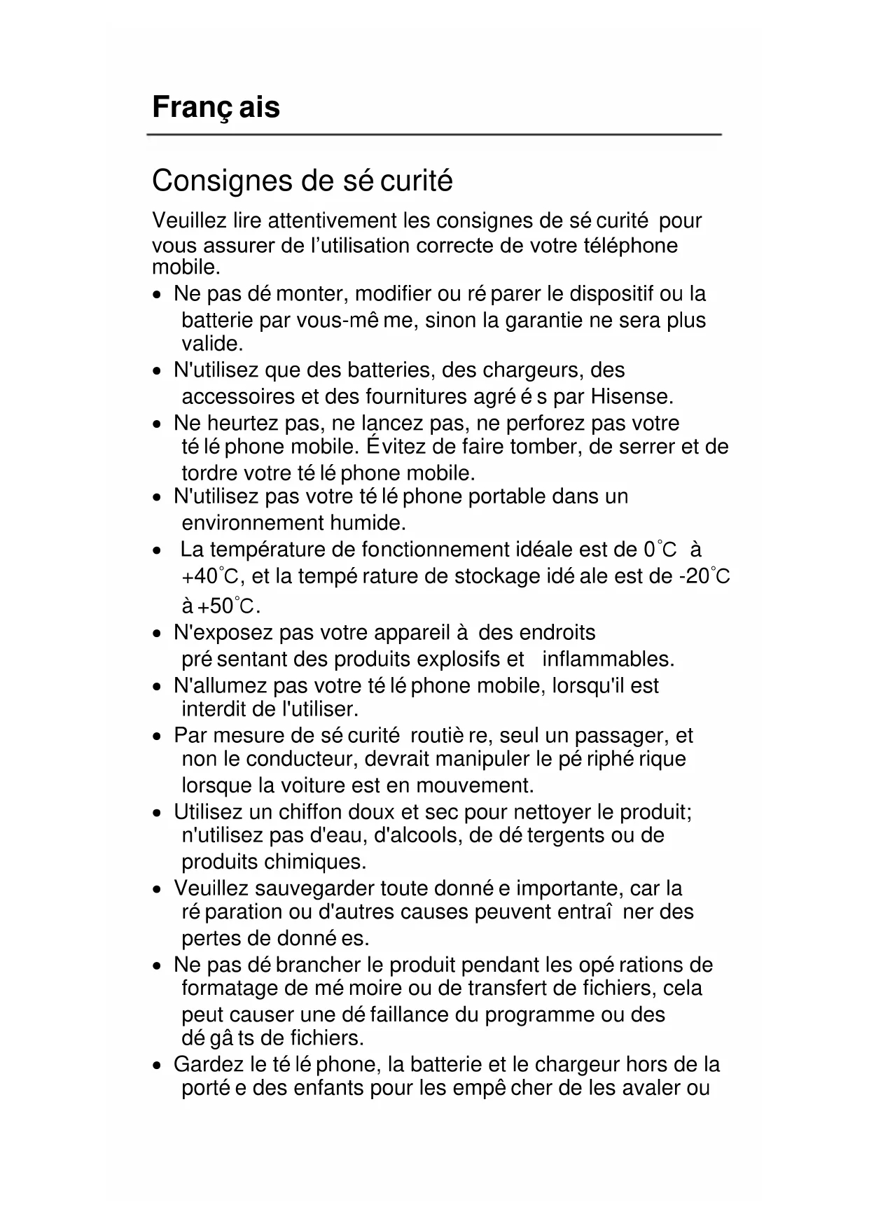 INSTRUCTIONS. Installing the card and battery This product is designed with non-removable battery and back cover. Firstly remove the card tray from the phone with the tool supplied to install the card .Then push the card into the corresponding slot. The contacts should be facing downwards. At last push the card and card tray to the phone. Getting started Press and hold the Power button until the screen is powered on and then follow the on-screen instructions. Updating your software Connect your smartphone to the Internet. If new software is available, you can update the software and the instructions on the device. Making an emergency call In an emergency situation, if the phone is on and you are within network range, it can be used to make an emergency call. However, emergency call numbers may not be reachable in all networks; you should never rely on your mobile phone for emergency calls. Getting detailed manual/Safety information Tap Product manual on the apps screen to find detailed operating instructions on your smartphone. Note: This manual is for your reference only, please refer to the actual product as standard.Français Consignes de sécurité Veuillez lire attentivement les consignes de sécurité pour vous assurer de l’utilisation correcte de votre téléphone mobile. Ne pas démonter, modifier ou réparer le dispositif ou la batterie par vous-même, sinon la garantie ne sera plus valide. N'utilisez que des batteries, des chargeurs, des accessoires et des fournitures agréés par Hisense. Ne heurtez pas, ne lancez pas, ne perforez pas votre téléphone mobile. Évitez de faire tomber, de serrer et de tordre votre téléphone mobile. N'utilisez pas votre téléphone portable dans un environnement humide. La température de fonctionnement idéale est de 0℃ à +40℃, et la température de stockage idéale est de -20℃ à +50℃. N'exposez pas votre appareil à des endroits présentant des produits explosifs et inflammables. N'allumez pas votre téléphone mobile, lorsqu'il est interdit de l'utiliser. Par mesure de sécurité routière, seul un passager, et non le conducteur, devrait manipuler le périphérique lorsque la voiture est en mouvement. Utilisez un chiffon doux et sec pour nettoyer le produit; n'utilisez pas d'eau, d'alcools, de détergents ou de produits chimiques. Veuillez sauvegarder toute donnée importante, car la réparation ou d'autres causes peuvent entraîner des pertes de données. Ne pas débrancher le produit pendant les opérations de formatage de mémoire ou de transfert de fichiers, cela peut causer une défaillance du programme ou des dégâts de fichiers. Gardez le téléphone, la batterie et le chargeur hors de la portée des enfants pour les empêcher de les avaler oude se blesser par accident. Les enfants ne doivent utiliser l'appareil que sous la surveillance d'un adulte. Respecter toutes les règles et réglementations applicables aux téléphones mobiles, dans les hôpitaux et les établissements de soins de santé. Utilisez uniquement la batterie et le chargeur fournis avec le produit. Ce produit a été testé et a enregistré une valeur DAS maximale de 0,722 W/kg pour la tête et 1,537 W/kg pour le corps. Pour éviter tout dommage auditif, n’écoutez pas à un niveau de volume élevé pendant de longues périodes. Ne jetez pas de téléphones ou des piles usagées dans une poubelle domestique. MISE EN GARDE: RISQUE D'EXPLOSION SI LA BATTERIE EST REMPLACÉE PAR UN TYPE