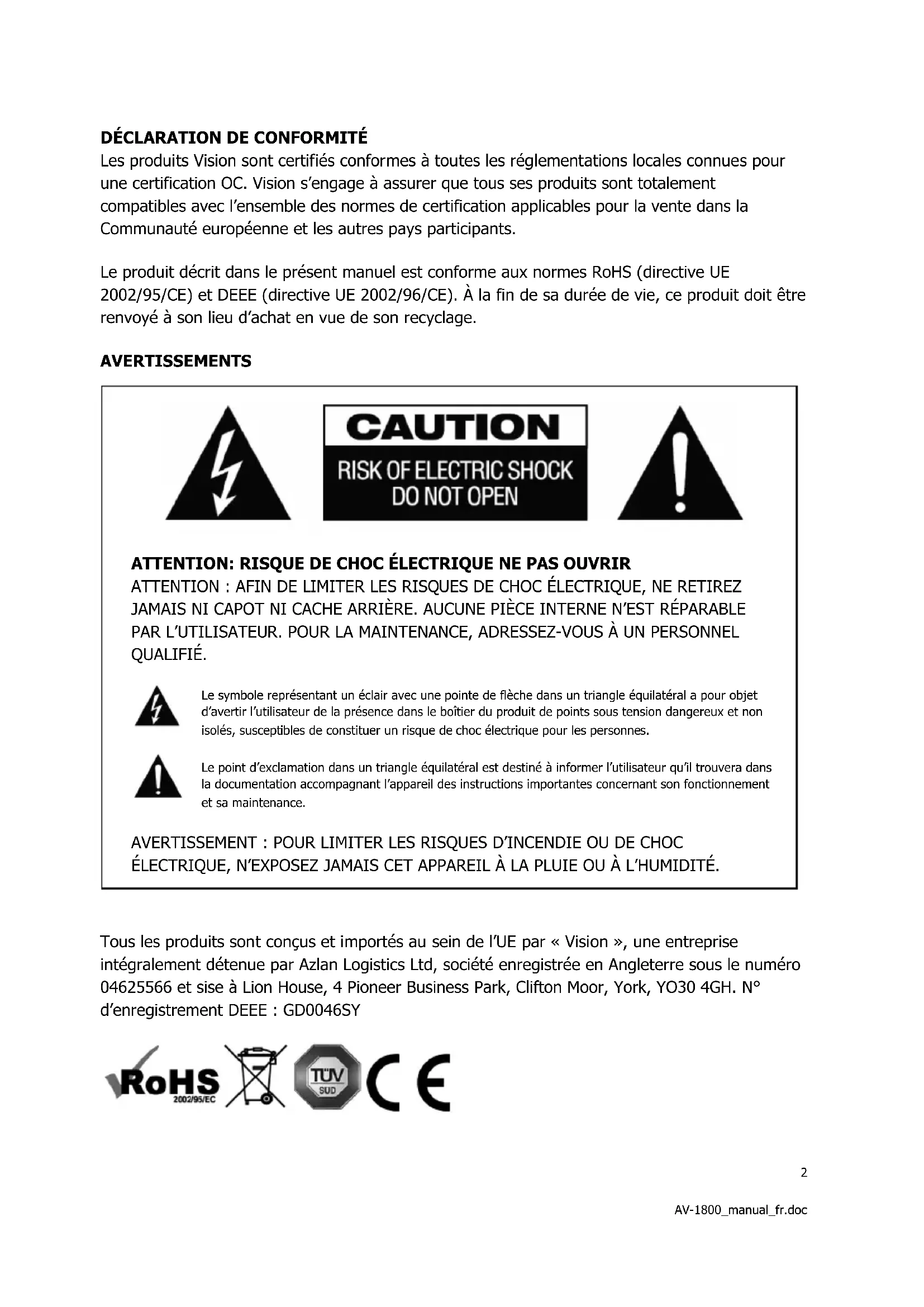 Tous les produits sont conçus et importés au sein de l'UE par « Vision », une entreprise intégralement détenue par Azlan Logistics Ltd, société enregistrée en Angleterre sous le numéro 04625566 et sise à Lion House, 4 Pioneer Business Park, Clifton Moor, York, YO30 4GH. N° d'enregistrement DEEE : GD0046SY