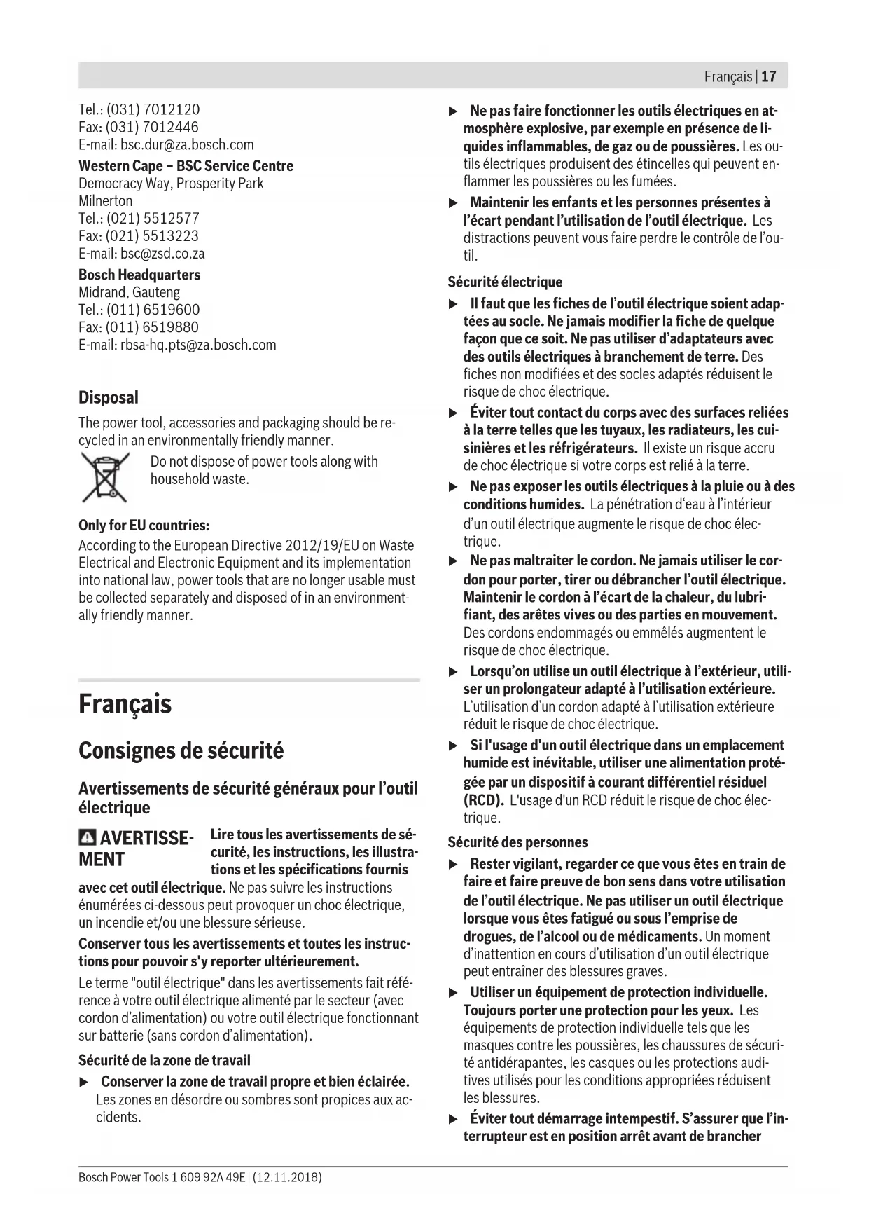 Le niveau de vibration et la valeur d’émission sonore indi- qués dans cette notice d’utilisation ont été mesurés confor- mément à la norme et peuvent être utilisés pour une compa- raison entre les outils électroportatifs. Ils peuvent aussi ser- vir de base à une estimation préliminaire du taux de vibration et du niveau sonore. Le niveau de vibration et la valeur d’émission sonore indi- qués s’appliquent pour les utilisations principales de l’outil électroportatif. Si l’outil électroportatif est utilisé pour d’autres applications, avec d’autres accessoires de travail ou sans avoir fait l’objet d’un entretien régulier, le niveau de vi- bration et la valeur d’émission sonore peuvent différer. Il peut en résulter des vibrations et un niveau sonore nette- ment plus élevés pendant toute la durée de travail. Pour une estimation précise du niveau de vibration et du ni- veau sonore, il faut aussi prendre en considération les pé- riodes pendant lesquelles l’outil est éteint ou bien en marche sans être vraiment en action. Il peut en résulter au final un ni- veau de vibration et un niveau sonore nettement plus faibles pendant toute la durée de travail. Prévoyez des mesures de protection supplémentaires per- mettant de protéger l’utilisateur de l’effet des vibrations, par exemple: maintenance de l’outil électroportatif et des acces- soires de travail, maintien des mains au chaud, organisation des procédures de travail. Montage u Débranchez le câble d’alimentation de la prise avant d’effectuer des travaux quels qu’il soient sur l’outil électroportatif. Changement d’accessoire u Attention lors du changement des fers de rabot. Ne touchez pas les bords tranchants des fers de rabot. Vous risqueriez de vous blesser. N’utilisez que des fers de rabot au carbure (HM/TC) d’origine Bosch. Le fer de rabot au carbure (HM/TC) dispose de 2 bords tranchants et il est réversible. Lorsque les deux bords tranchants sont émoussés, le fer de rabot (14) doit être remplacé. Le fer de rabot au carbure (HM/TC) ne doit pas être réaffûté. Démontage du fer de rabot (voir figure A) Pour retourner ou remplacer le fer de rabot (14), faites tour- ner la tête porte-fer (11), jusqu’à ce qu’elle soit parallèle à la semelle (9). ➊ Desserrez les 2 vis de fixation (13) d’env. 1 à – 2 tours à l’aide de la clé pour vis à six pans creux (15). ➋ Si nécessaire, desserrez l’élément de serrage (12) en donnant un léger coup à l’aide d’un outil approprié, p.ex. une cale en bois. ➌ À l’aide d’un morceau de bois, poussez le fer de rabot (14) et faites-le sortir par le côté de la tête porte-fer (11). Montage d’un fer de rabot (voir figure B) La rainure de guidage du fer de rabot fait en sorte que la hau- teur de réglage soit toujours correcte lorsqu’on change ou retourne le fer. Nettoyez si nécessaire le logement du fer dans l’élément de serrage (12) ainsi que le fer de rabot (14). Lors de la mise en place du fer de rabot, veillez à le loger correctement dans le guidage de l’élément de serrage (12) et à le positionner au ras du bord latéral de la semelle arrière (9). Resserrez en- suite les 2 vis de fixation (13) à l’aide de la clé mâle pour vis à six pans creux (15). Remarque : Avant de mettre en marche l’outil électroporta- tif, contrôlez le serrage des vis de fixation (13). Tournez la tête porte-fer (11) à la main et assurez-vous que le fer de ra- bot ne frotte nulle part. Aspiration de poussières/de copeaux Les poussières de matériaux tels que peintures contenant du plomb, certains bois, minéraux ou métaux, peuvent être nui- sibles à la santé. Le contact avec les poussières ou leur inha- lation peut entraîner des réactions allergiques et/ou des ma- ladies respiratoires auprès de l’utilisateur ou des personnes se trouvant à proximité. Certaines poussières telles que les poussières de chêne ou de hêtre sont considérées comme cancérigènes, surtout en association avec des additifs pour le traitement du bois (chromate, lasure). Les matériaux contenant de l’amiante ne doivent être travaillés que par des personnes qualifiées. – Si possible, utilisez un dispositif d’aspiration des pous- sières approprié au matériau. – Veillez à bien aérer la zone de travail. – Il est recommandé de porter un masque respiratoire avec un niveau de filtration de classe P2. Respectez les règlements spécifiques aux matériaux à traiter en vigueur dans votre pays. u Évitez toute accumulation de poussières sur le lieu de travail. Les poussières peuvent facilement s’enflammer. Nettoyez régulièrement l’éjecteur de copeaux (1). Pour net- toyer un éjecteur de copeaux partiellement obstrué, utilisez un moyen approprié, parex. un morceau de bois, de l’air comprimé etc. u Ne mettez jamais la main dans l’éjecteur de copeaux. Vous risqueriez d’être blessé par des pièces en rotation. Pour garantir une aspiration optimale, utilisez toujours un dispositif d’aspiration externe (aspirateur) ou un sac à pous- sière/copeaux. Aspiration au moyen d’un aspirateur (voir figure C) Il est possible de raccorder un flexible d’aspiration (Ø 35 mm) (16) (accessoire) des deux côtés (PHO 2000) ou d’un côté (PHO 1500) de l’éjecteur de copeaux. Raccordez l’autre extrémité du flexible d’aspiration (16) à un aspirateur (accessoire). Vous trouverez à la fin de cette no- tice une vue d’ensemble des aspirateurs auxquels peut être raccordé l’outil électroportatif. L’aspirateur doit être conçu pour le type de matériau à pon- cer. 1 609 92A 49E | (12.11.2018) Bosch Power ToolsFrançais | 21 Pour l’aspiration de poussières particulièrement nuisibles à la santé, cancérigènes ou sèches, utilisez un aspirateur spé- cial. Aspiration avec sac à poussière (voir figure C) Pour de petits travaux, il est possible d’utiliser un sac à pous-