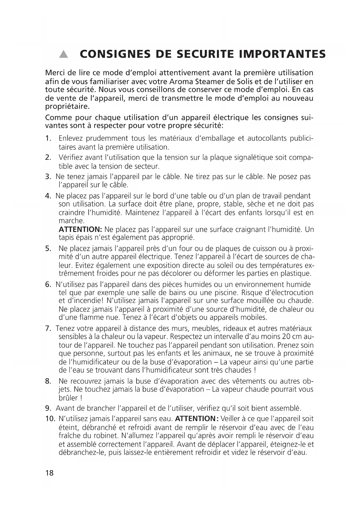 Merci de lire ce mode d’emploi attentivement avant la première utilisation afin de vous familiariser avec votre Aroma Steamer de Solis et de l’utiliser en toute sécurité. Nous vous conseillons de conserver ce mode d’emploi. En cas de vente de l’appareil, merci de transmettre le mode d’emploi au nouveau propriétaire. Comme pour chaque utilisation d’un appareil électrique les consignes sui- vantes sont à respecter pour votre propre sécurité: