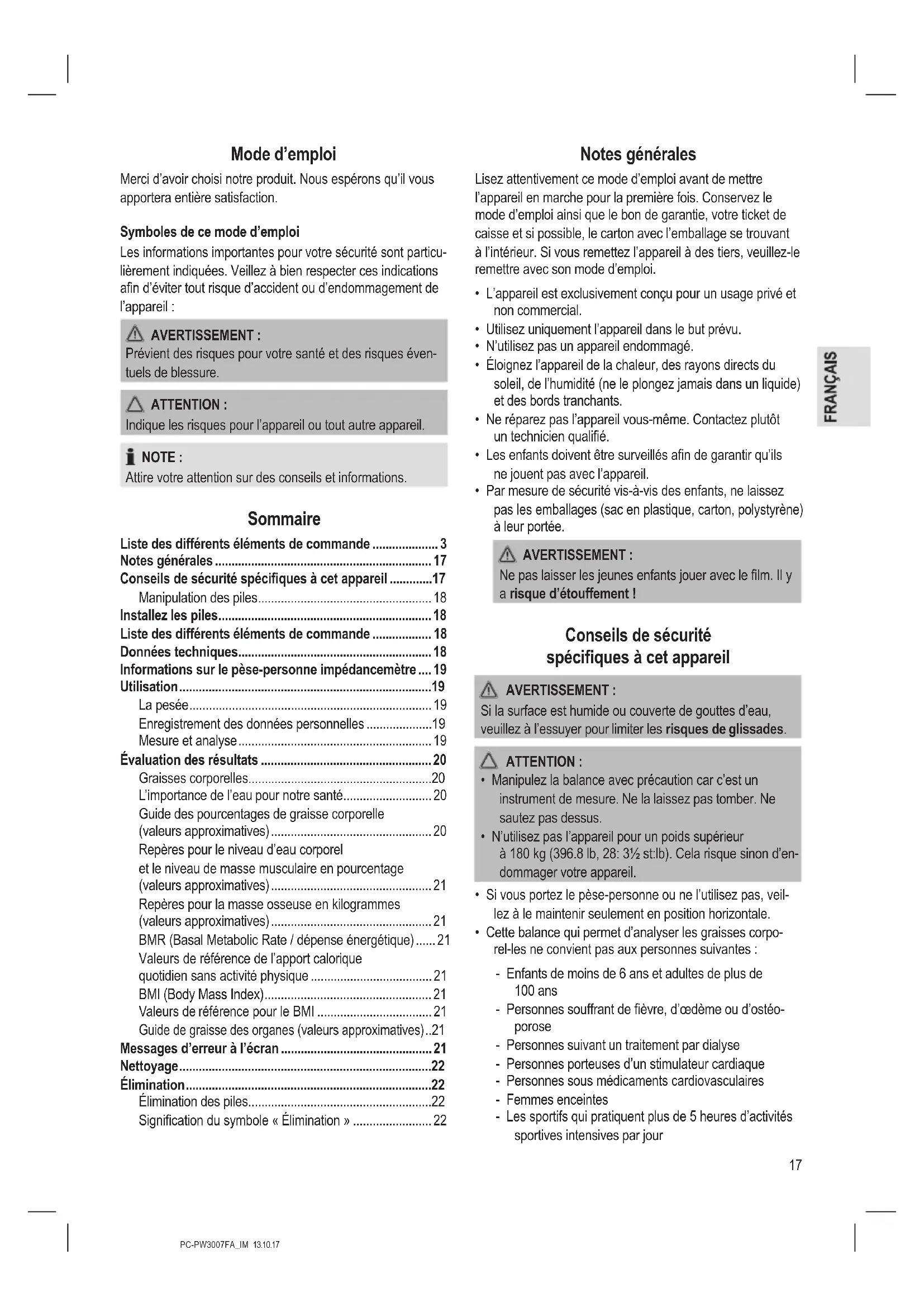 Informations sur le pèse-personne impédancemètre .... 19