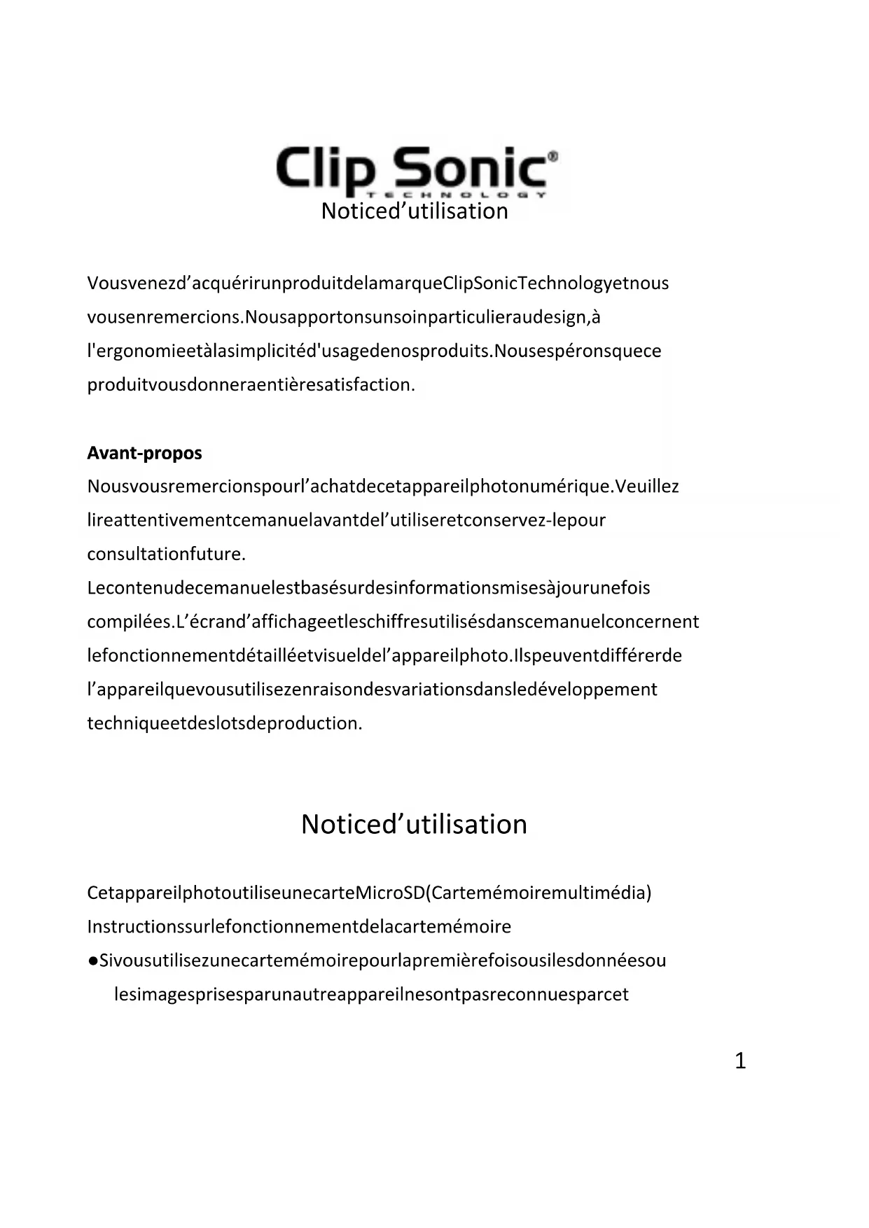 Vousvenezd’acquérirunproduitdelamarqueClipSonicTechnologyetnous vousenremercions.Nousapportonsunsoinparticulieraudesign,à l'ergonomieetàlasimplicitéd'usagedenosproduits.Nousespéronsquece produitvousdonneraentièresatisfaction. Avant-propos Avant-propos Avant-propos Avant-propos Nousvousremercionspourl’achatdecetappareilphotonumérique.Veuillez lireattentivementcemanuelavantdel’utiliseretconservez-lepour consultationfuture. Lecontenudecemanuelestbasésurdesinformationsmisesàjourunefois compilées.L’écrand’affichageetleschiffresutilisésdanscemanuelconcernent lefonctionnementdétailléetvisueldel’appareilphoto.Ilspeuventdifférerde l’appareilquevousutilisezenraisondesvariationsdansledéveloppement techniqueetdeslotsdeproduction. Noticed’utilisation CetappareilphotoutiliseunecarteMicroSD(Cartemémoiremultimédia) Instructionssurlefonctionnementdelacartemémoire ●Sivousutilisezunecartemémoirepourlapremièrefoisousilesdonnéesou lesimagesprisesparunautreappareilnesontpasreconnuesparcetNoticed’utilisation