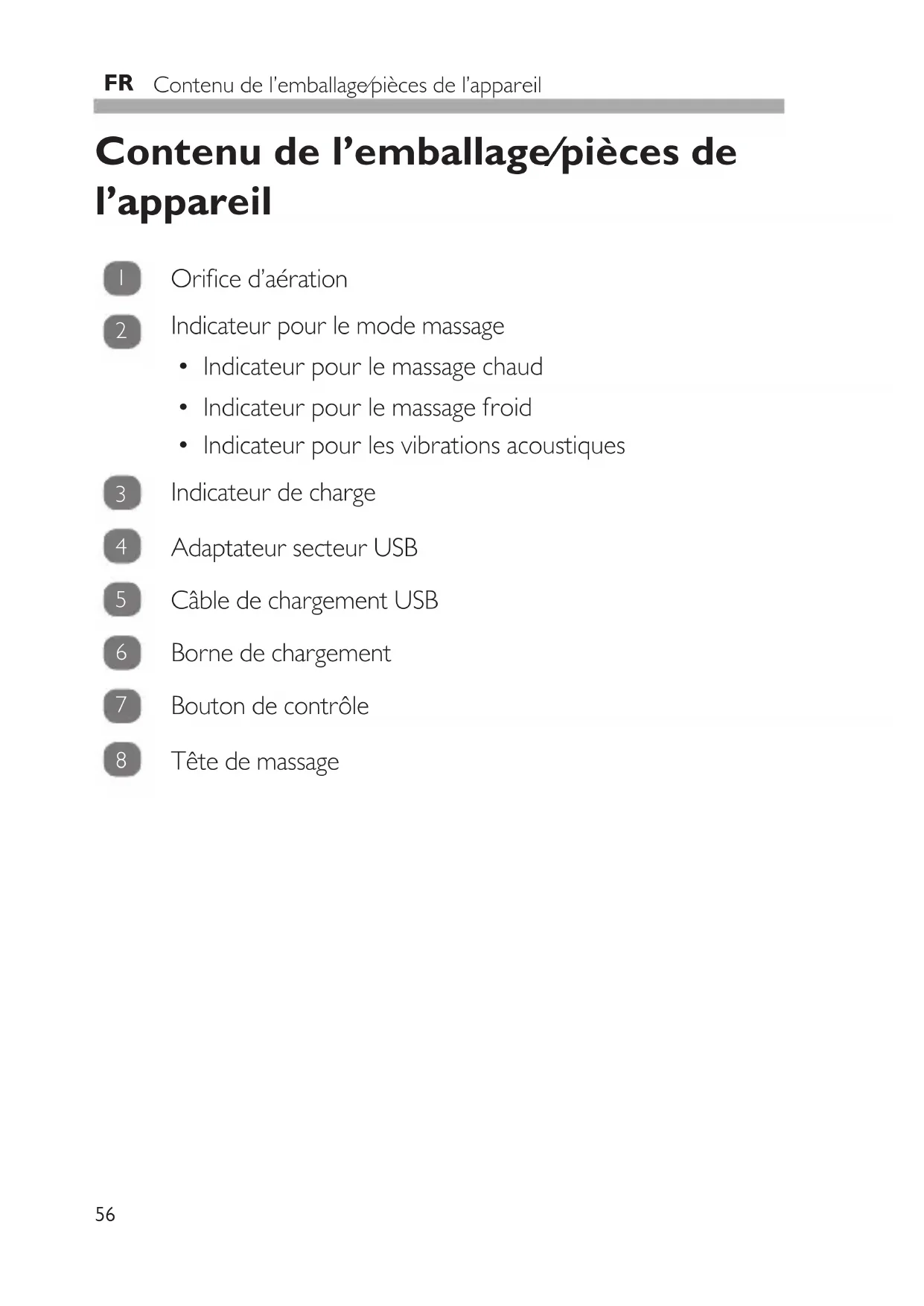 L'indicateur de charge 3 s'allume en rouge pendant le charge-ment. Il faut environ 3 heures au SkinVivid pour charger complètement l'accu.