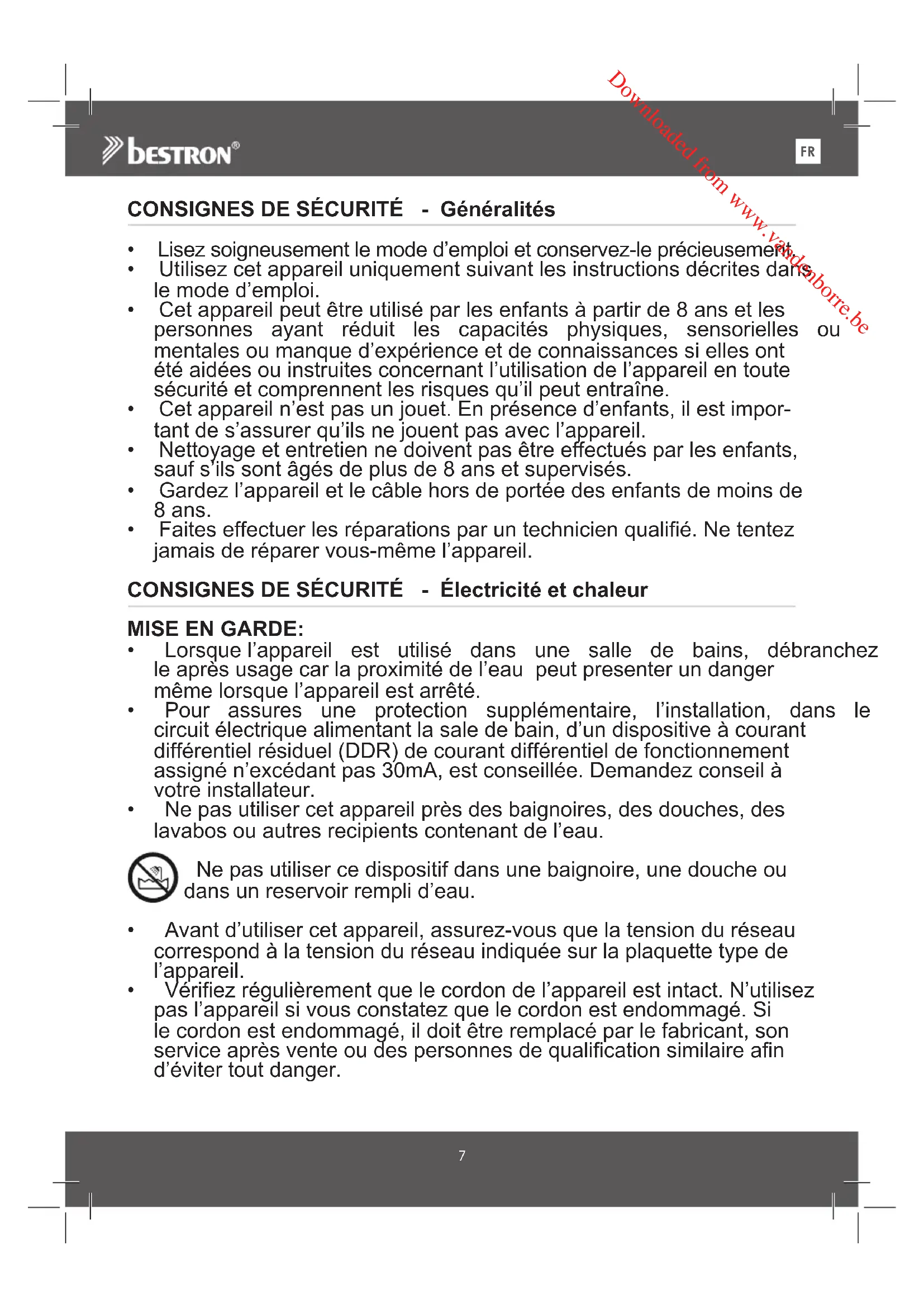 - Lorsque l'appareil est utilisé dans une salle de bains, débranchez le après usage car la proximité de l'eau peut presenter un danger même lorsque l'appareil est arrêté.