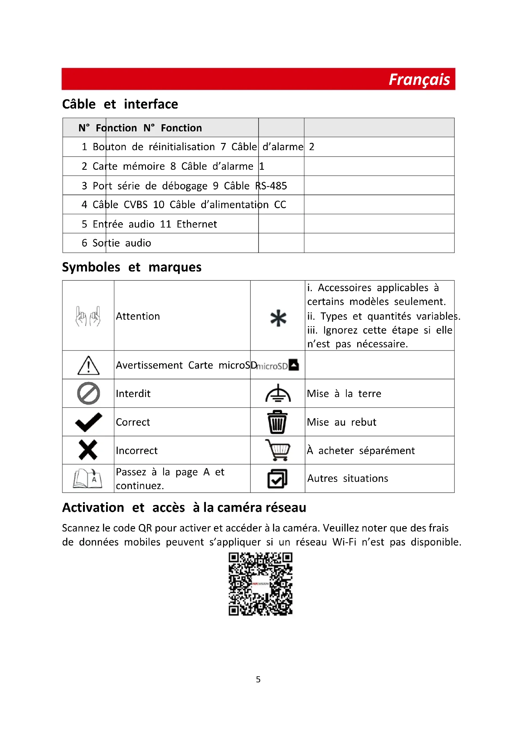 n’est pas nécessaire. Avertissement Carte microSD Interdit Mise à la terre Correct Mise au rebut Incorrect À acheter séparément Passez à la page A et continuez. Autres situations Activation et accès à la caméra réseau Scannez le code QR pour activer et accéder à la caméra. Veuillez noter que des frais de données mobiles peuvent s’appliquer si un réseau Wi-Fi n’est pas disponible.6 Réinitialisation et restauration de la caméra Appuyez sur le bouton de réinitialisation pendant environ 10 s lors de la mise en marche ou du redémarrage de la caméra pour restaurer les paramètres par défaut, notamment le nom d’utilisateur, le mot de passe, l’adresse IP, le numéro de port, etc. Manuel d’utilisation et questions fréquentes Pour des instructions plus détaillées, scannez le code QR ci-dessous pour consulter le manuel d’utilisation. La fonction peut varier selon le modèle de caméra. Référez-vous au produit réel. Caméra tube thermique réseau Caméra bullet réseau bispectrale Questions fréquentes Conformité à la réglementation et consignes de sécurité Lisez soigneusement toutes les informations et instructions de ce document avant d’utiliser l’appareil et conservez-le pour toute référence ultérieure. Pour plus d’informations et d’instructions sur l’appareil, veuillez consulter notre site Internet à l’adresse https://www.hikvision.com. Vous pouvez également consulter les autres documents (le cas échéant) accompagnant l’appareil ou scanner le code QR (le cas échéant) sur l’emballage pour obtenir plus d’informations. Clause d’exclusion de responsabilité DANS LES LIMITES AUTORISÉES PAR LA LOI EN VIGUEUR, LE PRÉSENT MANUEL ET LE PRODUIT DÉCRIT, AINSI QUE SON MATÉRIEL, SES LOGICIELS ET SES MICROLOGICIELS, SONT FOURNIS « EN L’ÉTAT » ET « AVEC CES FAIBLESSES ET ERREURS ». HIKVISION NE FAIT AUCUNE GARANTIE, EXPLICITE OU IMPLICITE, Y COMPRIS, MAIS SANS S’Y LIMITER, DE QUALITÉ
