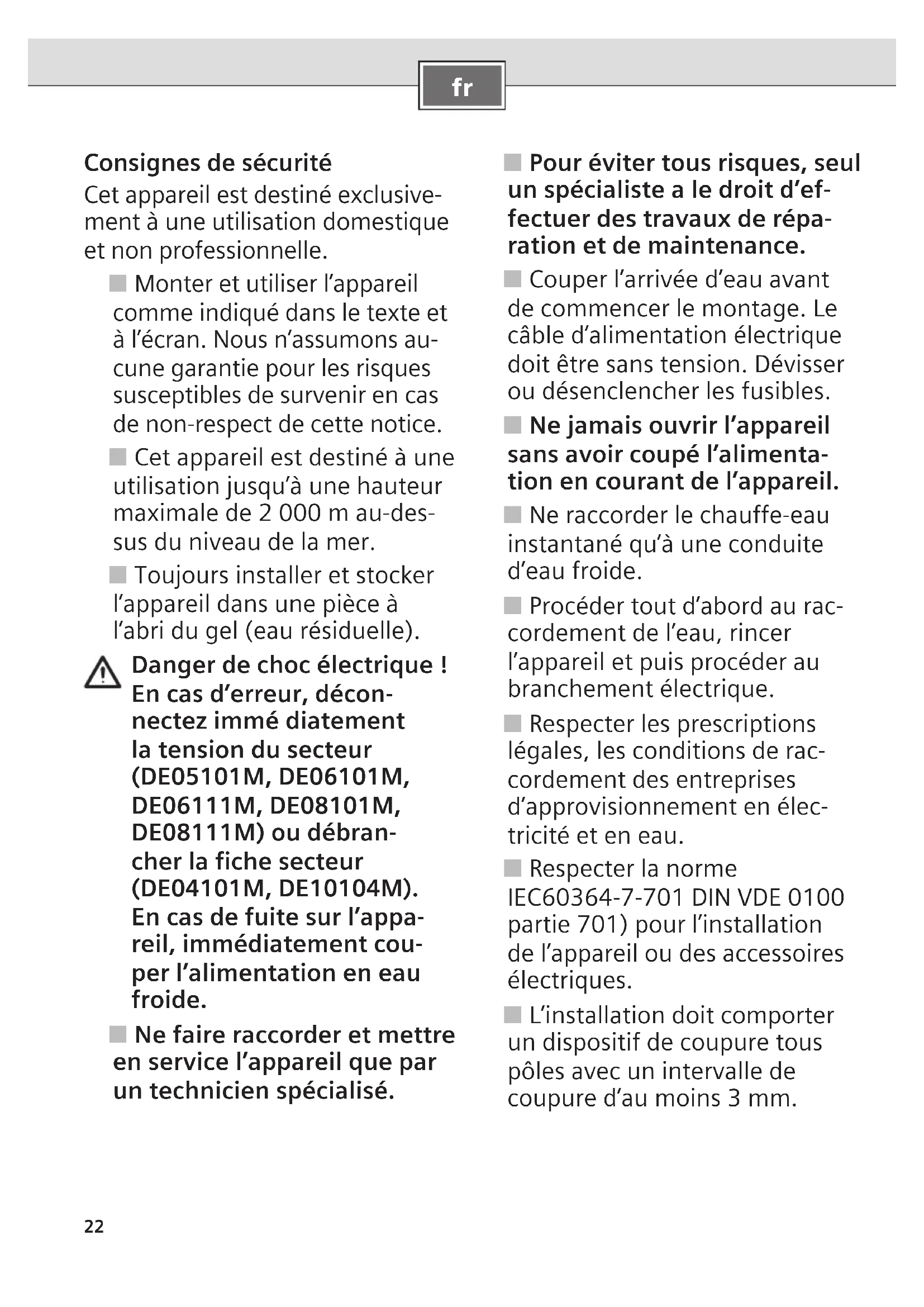 Consignes de sécurité Cet appareil est destiné exclusive- ment à une utilisation domestique et non professionnelle. ■ Monter et utiliser l’appareil comme indiqué dans le texte et à l’écran. Nous n’assumons au- cune garantie pour les risques susceptibles de survenir en cas de non-respect de cette notice. ■ Cet appareil est destiné à une utilisation jusqu’à une hauteur maximale de 2 000 m au-des- sus du niveau de la mer. ■ Toujours installer et stocker l’appareil dans une pièce à l’abri du gel (eau résiduelle). Danger de choc électrique ! En cas d’erreur, décon- nectez immé diatement la tension du secteur (DE05101M, DE06101M, DE06111M, DE08101M, DE08111M) ou débran- cher la fiche secteur (DE04101M, DE10104M). En cas de fuite sur l’appa- reil, immédiatement cou- per l’alimentation en eau froide. ■ Ne faire raccorder et mettre en service l’appareil que par un technicien spécialisé. ■ Pour éviter tous risques, seul un spécialiste a le droit d’ef- fectuer des travaux de répa- ration et de maintenance. ■ Couper l’arrivée d’eau avant de commencer le montage. Le câble d’alimentation électrique doit être sans tension. Dévisser ou désenclencher les fusibles. ■ Ne jamais ouvrir l’appareil sans avoir coupé l’alimenta- tion en courant de l’appareil. ■ Ne raccorder le chauffe-eau instantané qu’à une conduite d’eau froide. ■ Procéder tout d’abord au rac- cordement de l’eau, rincer l’appareil et puis procéder au branchement électrique. ■ Respecter les prescriptions légales, les conditions de rac- cordement des entreprises d’approvisionnement en élec- tricité et en eau. ■ Respecter la norme