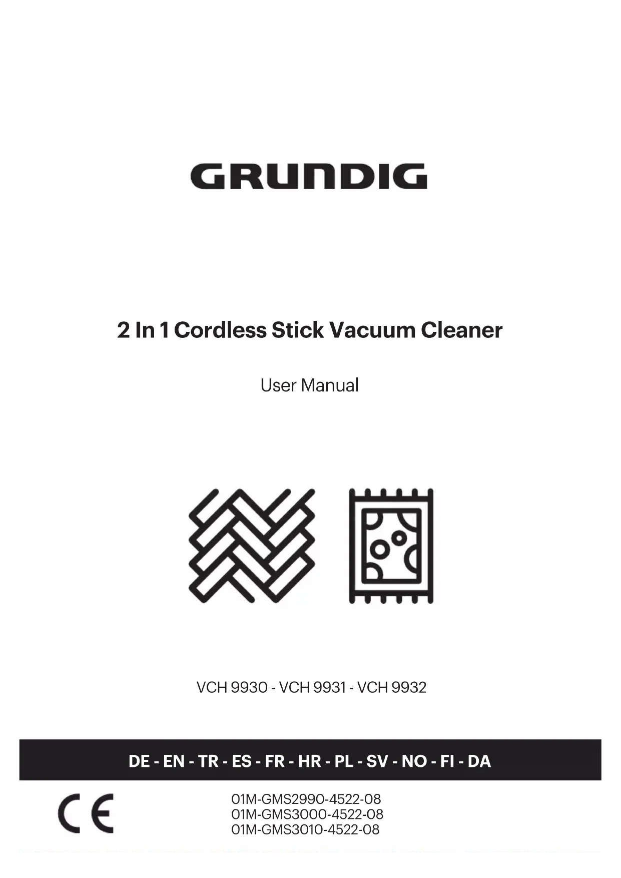 Avant de nettoyer ou d’entretenir l’appareil, assurez-vous d’avoir débranché au préalable la fiche de la sortie de la prise.APERÇU ___________________________________ Chère cliente, cher client, Toutes nos félicitations pour l’achat de votre nouvel aspirateur vertical rechargeable 2 en 1 GRUNDIG VCH 9930, VCH 9931, VCH 9932. Veuillez lire attentivement les consignes d'utilisation ci-après pour profiter au maximum, pendant de nombreuses années à venir, de votre produit de qualité Grundig. Une approche responsable ! GRUNDIG se concentre sur des conditions de travail sociales avec des salaires justes pour ses employés et ses fournisseurs, sur l’utilisation efficace de matériaux bruts avec une constante réduction des déchets de plusieurs tonnes de plastique chaque année – et sur une disponibilité d’au moins 5 ans de tous les accessoires. Pour un avenir digne d’être vécu. Grundig. Accessoires supplémen- taires: