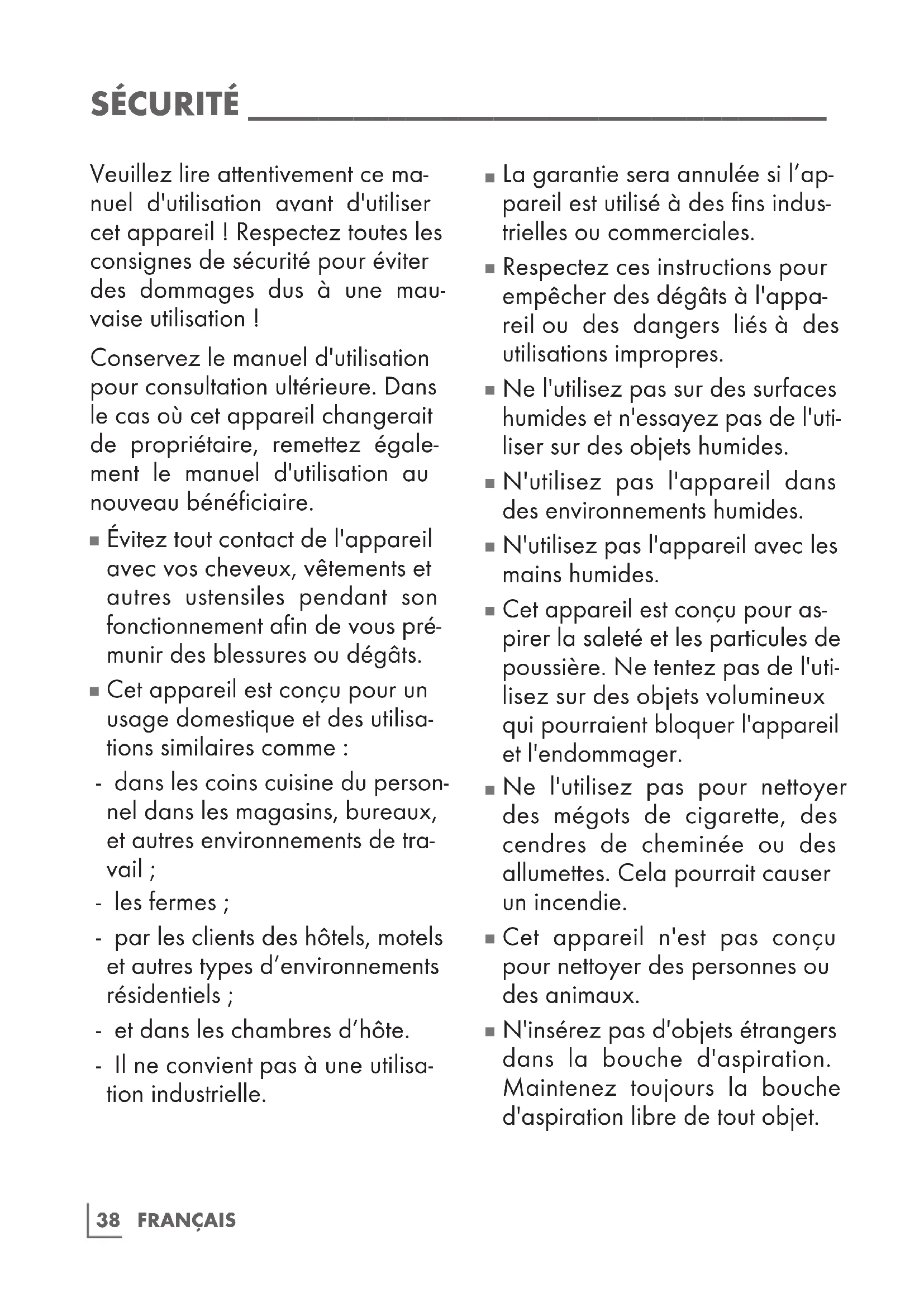 La garantie sera annulée si l'appareil est utilisé à des fins industrielles ou commerciales. Respectez ces instructions pour empêcher des dégâts à l'appareil ou des dangers liés à des utilisations impropres. - Ne l'utilisez pas sur des surfaces humides et n'essayez pas de l'utiliser sur des objets humides. N'utilisez pas l'appareil dans des environnements humides. N'utilisez pas l'appareil avec les mains humides. Cet appareil est conçu pour aspirer la saleté et les particules de poussière. Ne tentez pas de l'utiliser sur des objets volumineux qui pourraient bloquer l'appareil et l'endommager. Ne l'utilisez pas pour nettoyer des mégots de cigarette, des cendres de cheminée ou des allumettes. Cela pourrait causer un incendie. Cet appareil n'est pas conçu pour nettoyer des personnes ou des animaux. N'insérez pas d'objets étrangers dans la bouche d'aspiration. Maintenez toujours la bouche d'aspiration libre de tout objet.