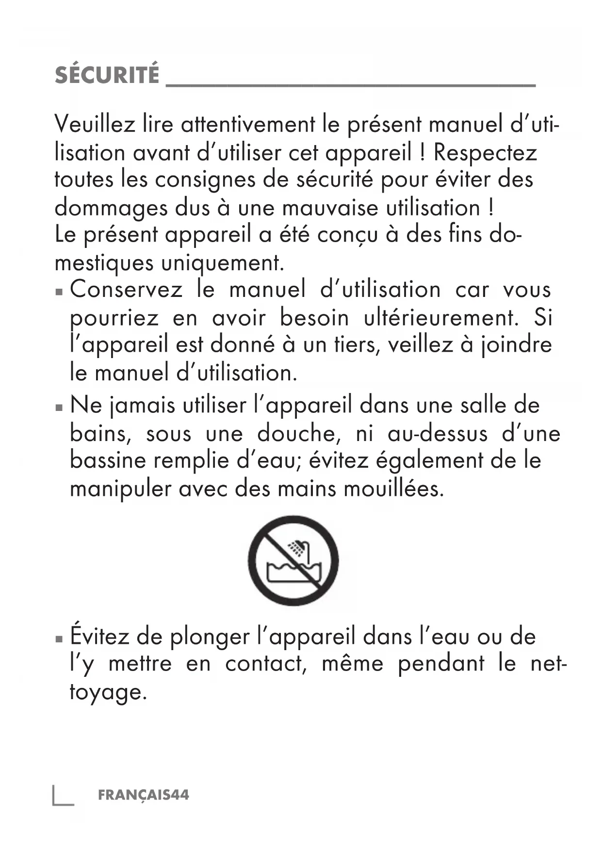 50-60Hz Potencia: 1580-1850 W Clase de aislamiento eléctrico: II Queda reservado el derecho a reali- zar modificaciones técnicas y de di- seño. Consulte la portada del ma- nual del usuario para su uso inicial, uso general y las sec- ciones de limpieza.FRANÇAIS44 SÉCURITÉ ______________________________ Veuillez lire attentivement le présent manuel d’uti- lisation avant d’utiliser cet appareil ! Respectez toutes les consignes de sécurité pour éviter des dommages dus à une mauvaise utilisation ! Le présent appareil a été conçu à des fins do- mestiques uniquement.