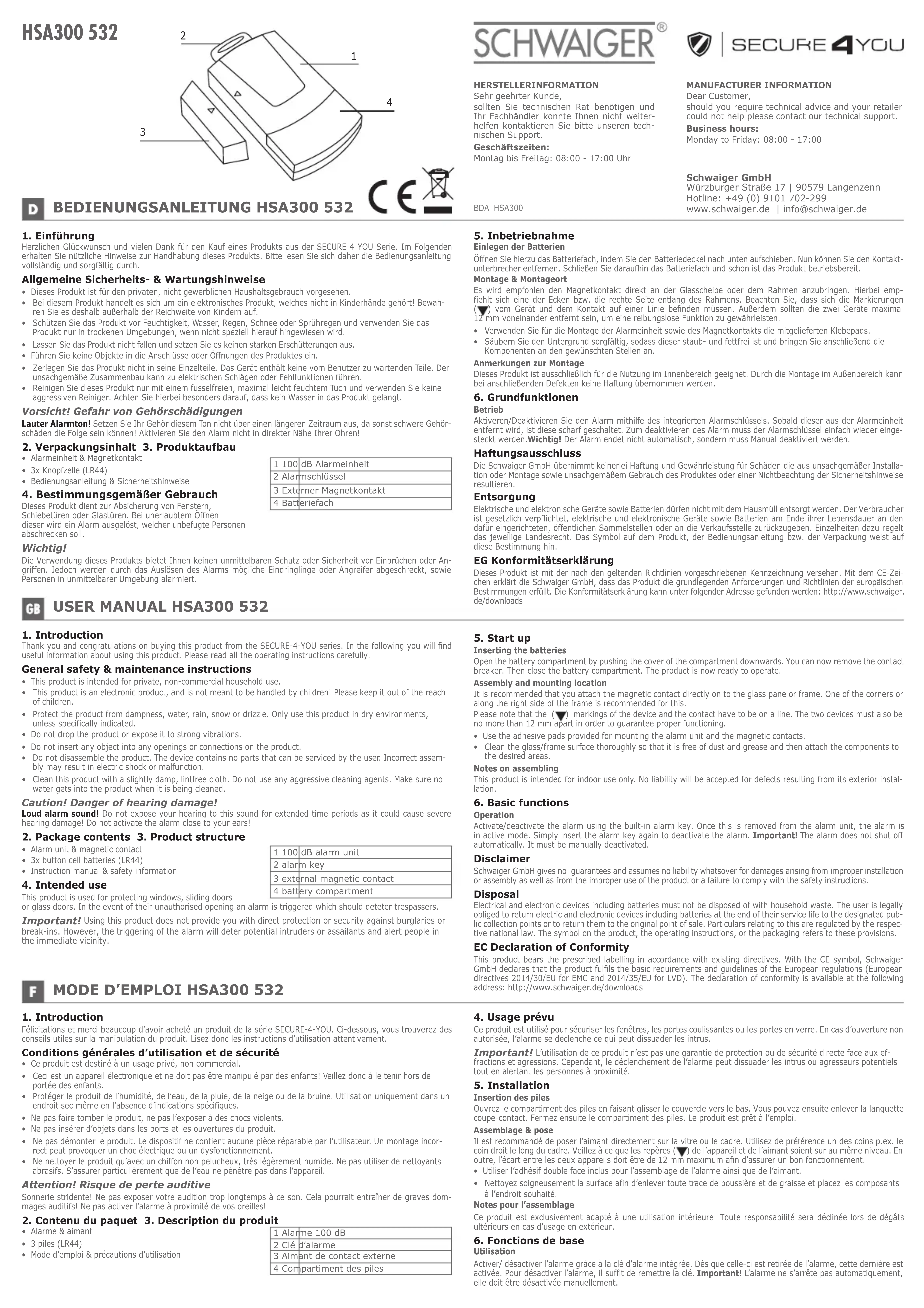 Félicitations et merci beaucoup d’avoir acheté un produit de la série SECURE-4-YOU. Ci-dessous, vous trouverez des conseils utiles sur la manipulation du produit. Lisez donc les instructions d’utilisation attentivement. Conditions générales d’utilisation et de sécurité