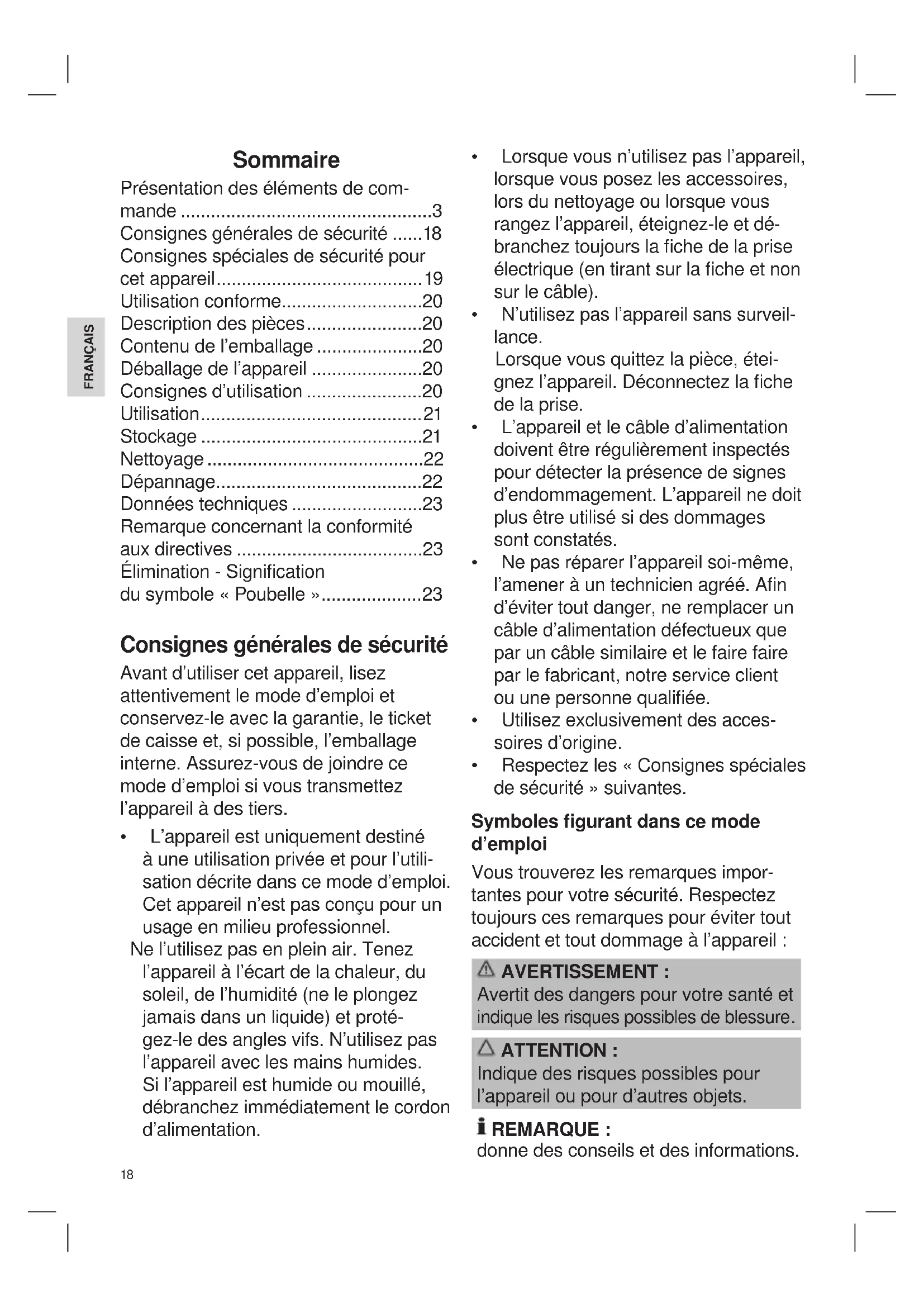 ATTENTION : Indique des risques possibles pour l’appareil ou pour d’autres objets. REMARQUE : donne des conseils et des informations.19 FRANÇAIS Enfants et personnes handicapées