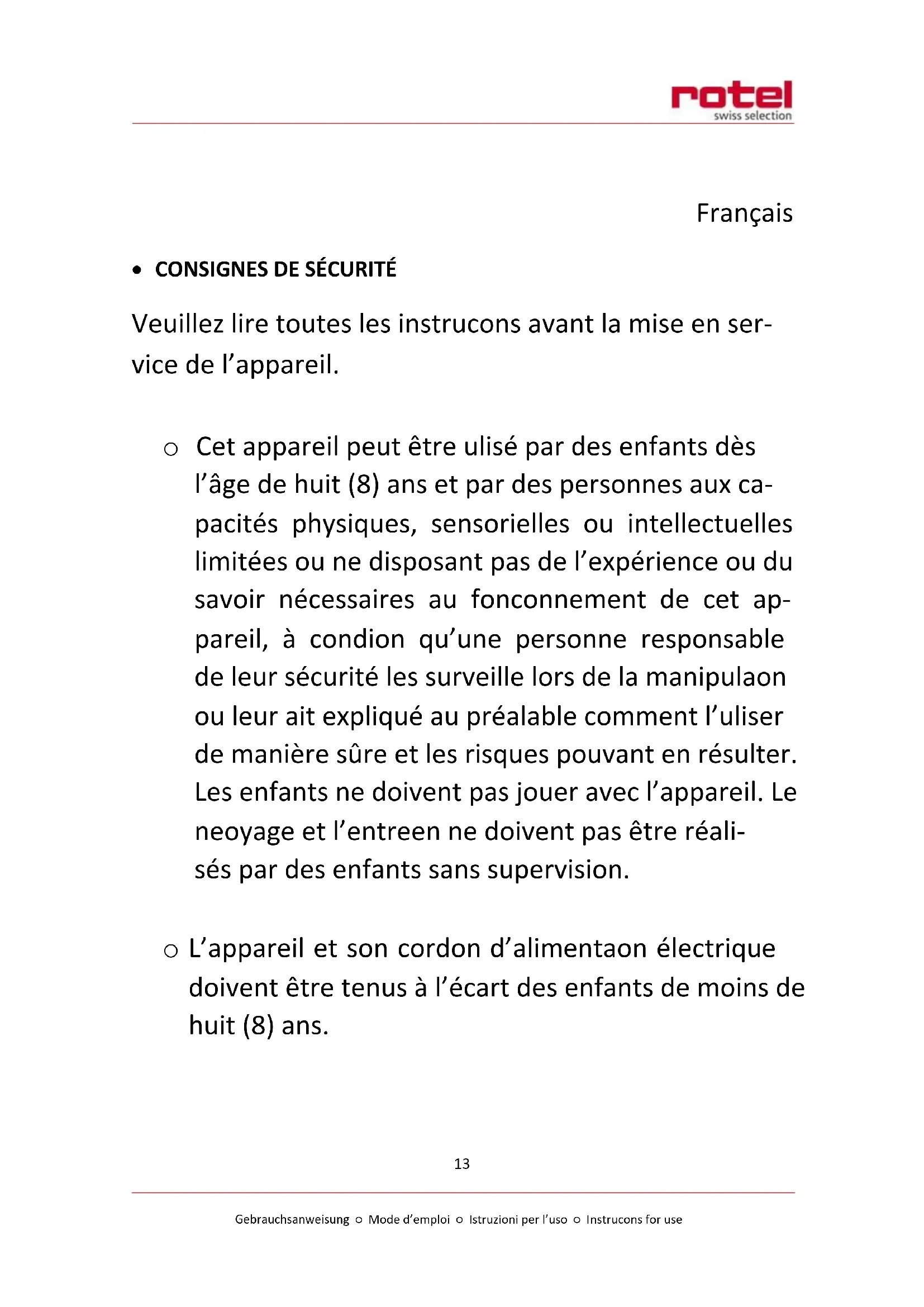 Cet apparéil peut être ulisé par des enfants dés l'âge de huit (8) ans et par des personnes aux capacités physiques, sensorielles ou intellectuelles limitées ou ne disposant pas de l'expérience ou du savoir nécessaires au fonconnement de cet apparéil, à condion qu'une personne responsable de leur sécurité les surveillance lors de la manipulaon ou leur ait expliqué au préalable comment l'uliser de manière sure et les risques pouvant en résultat. Les enfants ne doivent pas jouer avec l' apparéil. Le neoyage et l'entreen ne doivent pas être réalisés par des enfants sans supervision.
