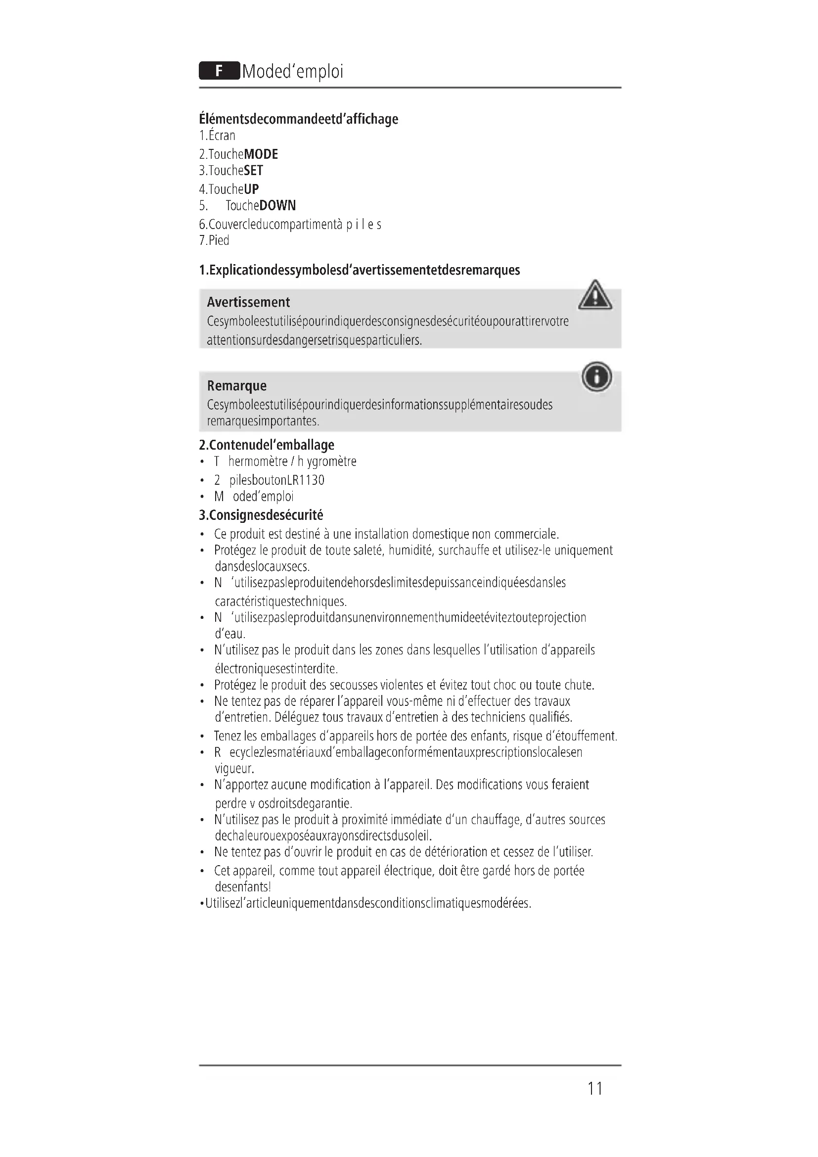 - Utilisez l’article uniquement dans des conditions climatiques modérées. F Mode d‘emploi12 Avertissement –concernant les piles