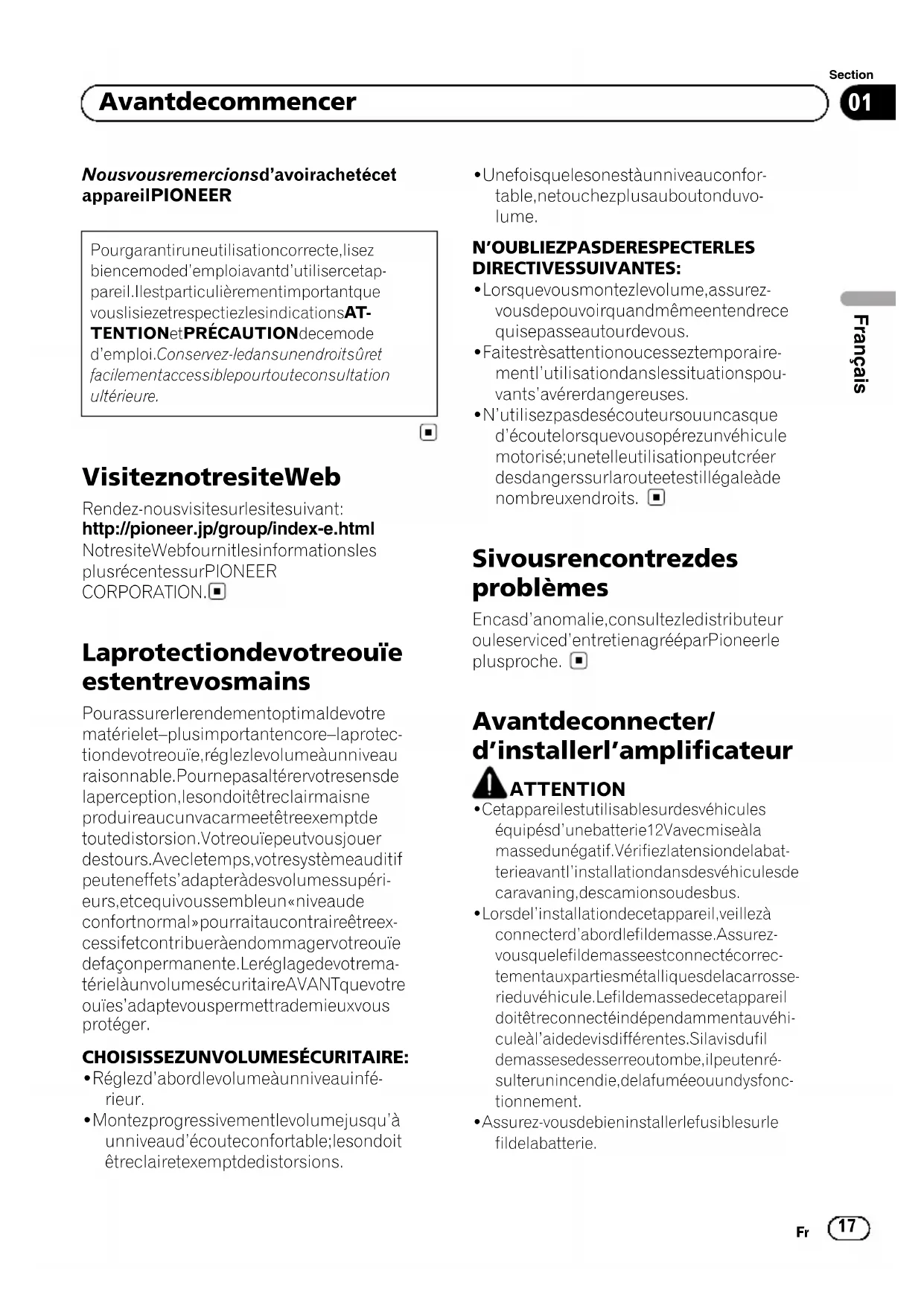 Appendix Additional informationNous vous remercions d’avoir acheté cet appareil PIONEER Pour garantir une utilisation correcte, lisez bien ce mode d’emploi avant d’utiliser cet ap- pareil. Il est particulièrement important que vous lisiez et respectiez les indications AT - TENTION et PRÉCAUTION de ce mode d’emploi. Conservez-le dans un endroit sûr et facilement accessible pour toute consultation ultérieure. Visitez notre site Web Rendez-nous visite sur le site suivant : http://pioneer.jp/group/index-e.html Notre site Web fournit les informations les plus récentes sur PIONEER CORPORATION. La protection de votre ouïe est entre vos mains Pour assurer le rendement optimal de votre matériel et – plus important encore – la protec- tion de votre ouïe, réglez le volume à un niveau raisonnable. Pour ne pas altérer votre sens de la perception, le son doit être clair mais ne produire aucun vacarme et être exempt de toute distorsion. Votre ouïe peut vous jouer des tours. Avec le temps, votre système auditif peut en effet s’adapter à des volumes supéri- eurs, et ce qui vous semble un « niveau de confort normal » pourrait au contraire être ex- cessif et contribuer à endommager votre ouïe de façon permanente. Le réglage de votre ma- tériel à un volume sécuritaire AVANT que votre ouïe s’adapte vous permettra de mieux vous protéger. CHOISISSEZ UN VOLUME SÉCURITAIRE : ! Réglez d’abord le volume à un niveau infé- rieur. ! Montez progressivement le volume jusqu’à un niveau d’écoute confortable ; le son doit être clair et exempt de distorsions. ! Une fois que le son est à un niveau confor- table, ne touchez plus au bouton du vo- lume.