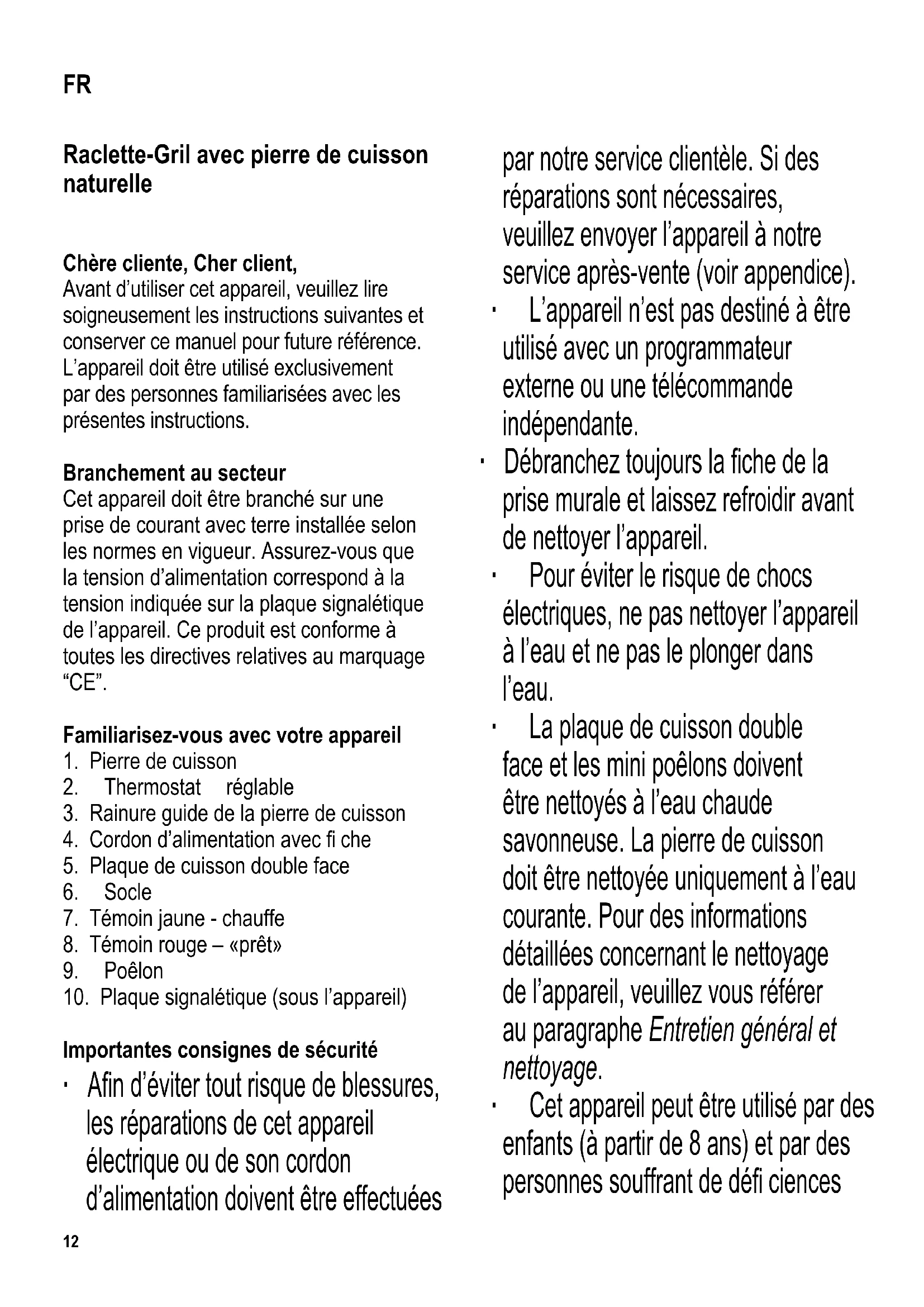 Importantes consignes de sécurité ∙ A fi n d’éviter tout risque de blessures, les réparations de cet appareil électrique ou de son cordon d’alimentation doivent être effectuées par notre service clientèle. Si des réparations sont nécessaires, veuillez envoyer l’appareil à notre service après-vente (voir appendice). ∙ L’appareil n’est pas destiné à être utilisé avec un programmateur externe ou une télécommande indépendante. ∙ Débranchez toujours la fi che de la prise murale et laissez refroidir avant de nettoyer l’appareil. ∙ Pour éviter le risque de chocs électriques, ne pas nettoyer l’appareil à l’eau et ne pas le plonger dans l’eau. ∙ La plaque de cuisson double face et les mini poêlons doivent être nettoyés à l’eau chaude savonneuse. La pierre de cuisson doit être nettoyée uniquement à l’eau courante. Pour des informations détaillées concernant le nettoyage de l’appareil, veuillez vous référer au paragraphe Entretien général et nettoyage. ∙ Cet appareil peut être utilisé par des enfants (à partir de 8 ans) et par des personnes souffrant de défi ciences FR13 physiques, sensorielles ou mentales, ou manquant d’expérience ou de connaissances, s’ils ont été formés à l’utilisation de l’appareil et ont été supervisés, et s’ils en comprennent les dangers et les précautions de sécurité à prendre. ∙ Les enfants ne sont pas autorisés à jouer avec l’appareil. ∙ Les enfants ne doivent pas être autorisés à nettoyer ou entretenir l’appareil à moins d’être supervisés et d’avoir plus de 8 ans. ∙ L’appareil et son cordon d’alimentation doivent être, à tout moment, tenus hors de portée des enfants de moins de 8 ans. ∙ Attention : Tenez les enfants à l’écart des emballages, qui représentent un risque potentiel, par exemple, de suffocation. ∙ Avant toute utilisation, vérifi ez soigneusement que l’appareil, son cordon d’alimentation et ses accessoires ne présentent aucun signe de détérioration qui pourrait avoir un effet néfaste sur la sécurité de fonctionnement de l’appareil. Au cas où l’appareil, par exemple, serait tombé sur une surface dure, ou si une force excessive aurait été employée pour tirer sur le cordon d’alimentation, il ne doit plus être utilisé. ∙ Les surfaces de l’appareil, la plaque de cuisson double face, la pierre de cuisson et les poêlons chauffent pendant le fonctionnement. Attention : risque de brûlure. ∙ Ne jamais faire fonctionner l’appareil sans surveillance. ∙ Le cordon doit toujours être tenu à l’écart des surfaces chaudes de l’appareil. ∙ Placez l’appareil sur une surface de travail plane, horizontale et résistante à la chaleur et aux éclaboussures d’eau ou de graisse. ∙ Prenez soin de ne pas placer l’appareil contre un mur ou dans un angle, et de le tenir à l’écart de toute matière infl ammable. ∙ Avant d’utiliser l’appareil, mettez en place la plaque de cuisson double face et la pierre de cuisson par dessus la résistance. ∙ Débranchez toujours la fi che de la prise murale - après utilisation, - en cas de fonctionnement défectueux, - avant de nettoyer l’appareil. ∙ Ne pas débrancher l’appareil en tirant sur le cordon ; tirez toujours sur la fi che. ∙ Nous déclinons toute responsabilité pour les dommages éventuels subis par cet appareil, résultant d’une utilisation incorrecte ou du non-respect de ce mode d’emploi. ∙ Cet appareil est destiné à une utilisation domestique ou similaire, telle que - dans des bureaux et autres locaux commerciaux, - dans des organisations agricoles, - par la clientèle dans les hôtels, motels et établissements similaires, - et dans des maisons d’hôtes.14 Fonctionnement Avant la première mise en marche ∙ Retirez complètement tous les emballages. ∙ Avant d’utiliser le gril pour la première fois, nettoyez la pierre de cuisson, la plaque de cuisson double face et les poêlons à l’aide d’un chiffon humide. ∙ Faites chauffer l’appareil et les mini poêlons pendant environ 10 minutes, à vide, pour éliminer l’odeur caractéristique qui se dégage lorsqu’un gril est allumé pour le première fois (on peut également constater une légère fumée) Pour cette raison, assurez-vous que la ventilation est adéquate en ouvrant les fenêtres et les porte-fenêtres. ∙ Nettoyez ensuite l’appareil tel indiqué au paragraphe Entretien général et nettoyage. Pierre de cuisson ∙ Placez la pierre de cuisson sur l’appareil, par-dessus la résistance, la face polie vers le haut. Attention : évitez de placer une pierre froide sur la résistance chaude. ∙ La pierre convient à la cuisson de légumes, viandes ou poissons en tranches etc. ∙ Cette pierre est constituée de matière naturelle. L’apparition de très fi nes fi ssures dues à l’expansion et la contraction pendant la cuisson, ainsi que la coloration plus marquée de la pierre, sont des phénomènes normaux sans effets préjudiciables. ∙ Ne placez sur la pierre aucun aliment surgelé ni aliment contenant du vinaigre (tel que cornichon au vinaigre ou moutarde). Plaque de cuisson double face ∙ Posez la plaque de cuisson sur l’appareil, par-dessus la résistance. ∙ Positionnée face rainurée vers le haut, la plaque s’utilise comme une plaque normale. La plaque de cuisson doit être légèrement graissée avant l’utilisation. L’autre face peut être utilisée pour la cuisson de 4 mini-crêpes. Thermostat réglable et témoin lumineux Avec le thermostat sur sa position maximum (à droite), la résistance reste allumée quasiment en continu. Si vous baissez le thermostat (vers la gauche), la résistance s’allume seulement par intermittence. Le témoin jaune reste allumé lorsque la résistance chauffe. Une fois la cuisson terminée, réglez la commande du thermostat sur la position minimum. Fonctionnement ∙ Placez la pierre de cuisson e