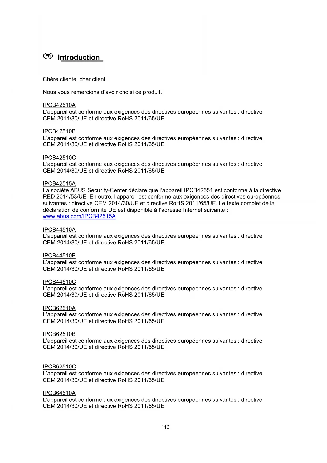 Chère cliente, cher client, Nous vous remercions d’avoir choisi ce produit. IPCB42510A L’appareil est conforme aux exigences des directives européennes suivantes : directive CEM 2014/30/UE et directive RoHS 2011/65/UE. IPCB42510B L’appareil est conforme aux exigences des directives européennes suivantes : directive CEM 2014/30/UE et directive RoHS 2011/65/UE. IPCB42510C L’appareil est conforme aux exigences des directives européennes suivantes : directive CEM 2014/30/UE et directive RoHS 2011/65/UE. IPCB42515A La société ABUS Security-Center déclare que l’appareil IPCB42551 est conforme à la directive RED 2014/53/UE. En outre, l’appareil est conforme aux exigences des directives européennes suivantes : directive CEM 2014/30/UE et directive RoHS 2011/65/UE. Le texte complet de la déclaration de conformité UE est disponible à l’adresse Internet suivante : www.abus.com/IPCB42515A IPCB44510A L’appareil est conforme aux exigences des directives européennes suivantes : directive CEM 2014/30/UE et directive RoHS 2011/65/UE. IPCB44510B L’appareil est conforme aux exigences des directives européennes suivantes : directive CEM 2014/30/UE et directive RoHS 2011/65/UE. IPCB44510C L’appareil est conforme aux exigences des directives européennes suivantes : directive CEM 2014/30/UE et directive RoHS 2011/65/UE. IPCB62510A L’appareil est conforme aux exigences des directives européennes suivantes : directive CEM 2014/30/UE et directive RoHS 2011/65/UE. IPCB62510B L’appareil est conforme aux exigences des directives européennes suivantes : directive CEM 2014/30/UE et directive RoHS 2011/65/UE.