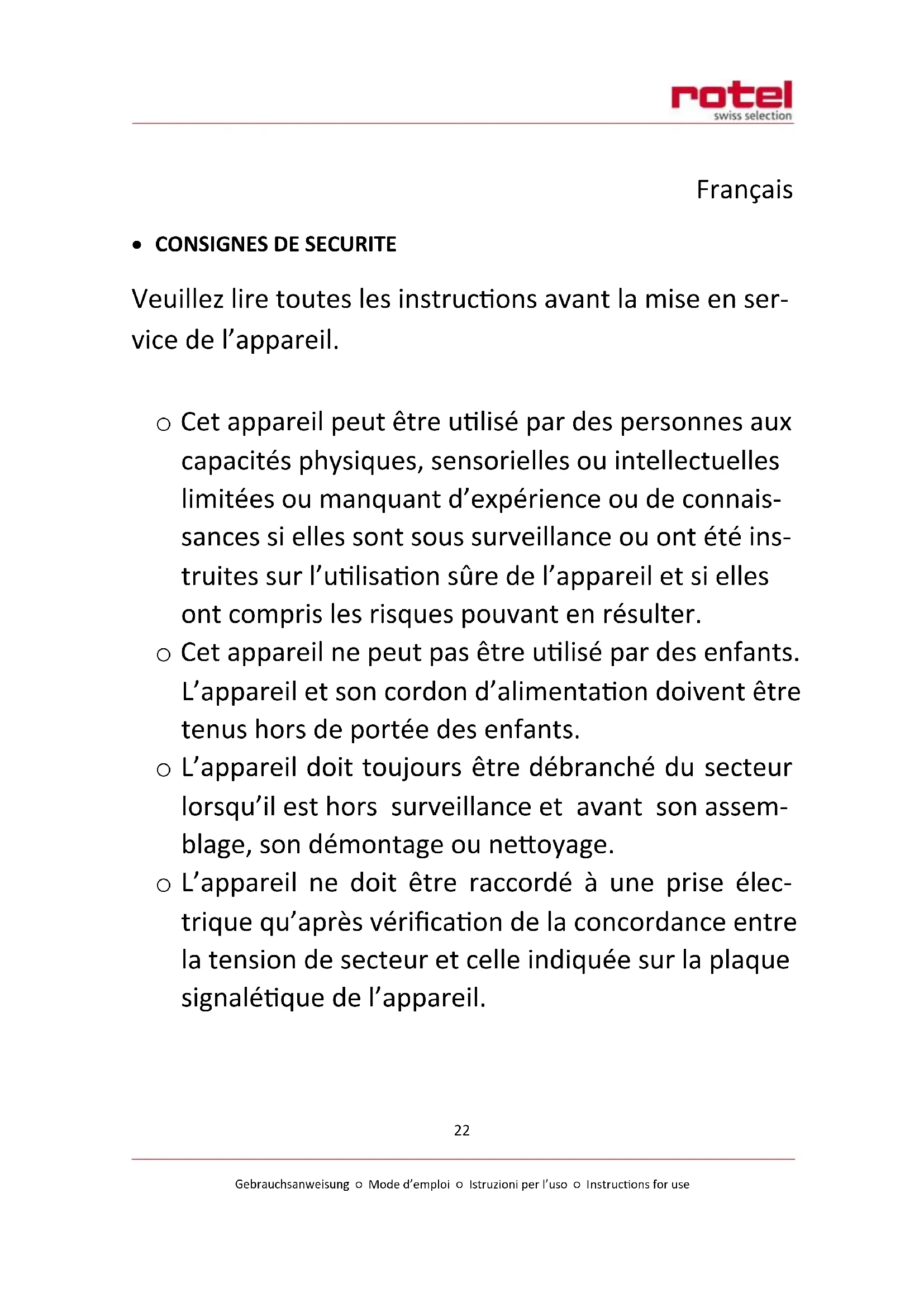 Pour une élimination dans les règles de l'art, veuillez remettre l'appareil à un reven- deur, un responsable du service après-vente ou Rotel SA.