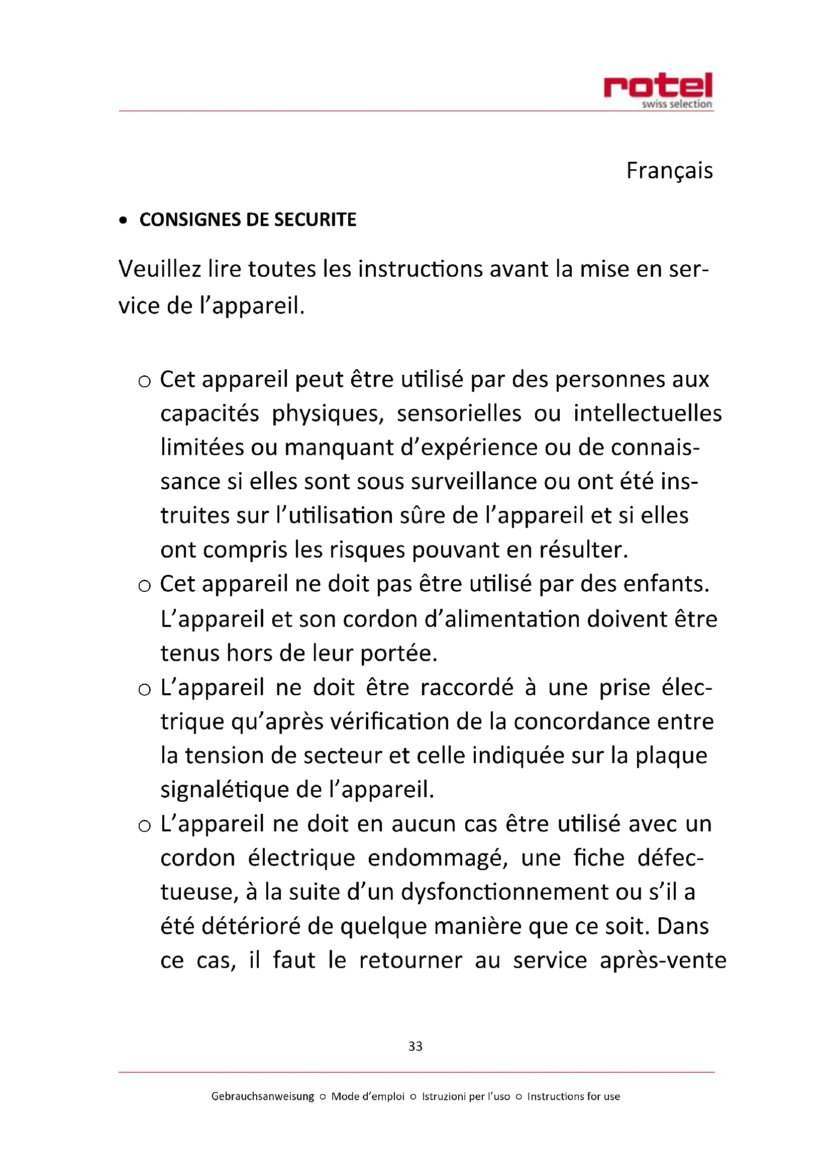 Pour une élimination dans les règles de l'art, veuillez remettre l'appareil à un reven- deur, un responsable du service après-vente ou Rotel SA.
