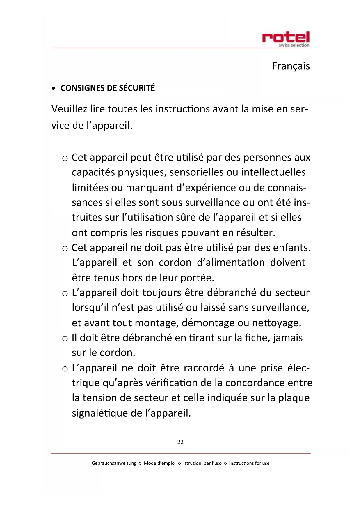 ÉLIMINATION o Pour une élimination dans les règles de l’art, veuillez remettre l’appareil à un reven- deur, un responsable du service après-vente ou Rotel SA. o Selon la directive européenne 2012/19/UE relative aux déchets d’équipements élec- triques et électroniques (DEEE), les appareils électroménagers ne doivent pas être éliminés avec les déchets solides urbains normaux. Les appareils hors d’usage doivent être collectés séparément pour optimiser le coût de réutilisation et de recyclage des matériaux contenus dans la machine tout en évitant les risques potentiels pour la santé publique et l’environnement. Le symbole de poubelle barrée figure sur tous les produits pour rappeler à leur propriétaire les obligations de tri sélectif des déchets. Pour de plus amples informations sur la mise au rebut correcte des appareils électro- ménagers, les consommateurs sont invités à contacter les autorités locales ou ven- deurs d’électroménagers. Cet appareil est conforme aux directives européennes suivantes : 2014/35/UE (Équipement basse tension) 2014/30/UE (Compatibilité électromagnétique)Gebrauchsanweisung ○ Mode d’emploi ○ Istruzioni per l’uso ○ Instructions for use