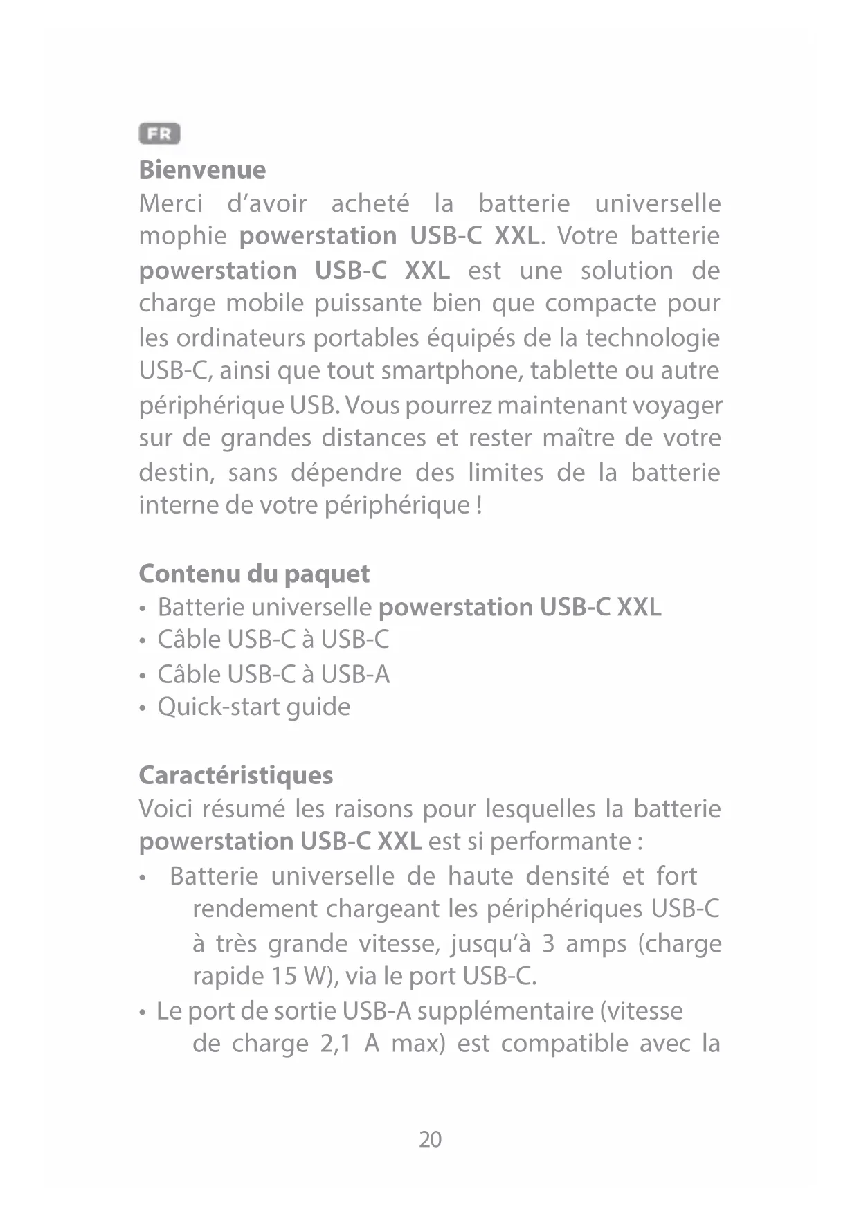 Merci d'avoir acheté la batterie universelle mophie powerstation USB-C XXL. Votre batterie powerstation USB-C XXL est une solution de charge mobile puissante bien que compacte pour les ordinateurs portables équipés de la technologie USB-C, ainsi que tout smartphone, tablette ou autre périphérique USB. Vous pourrez maintenant voyager sur de grandes distances et rester maître de votre destin, sans dépendre des limites de la batterie interne de votre périphérique !