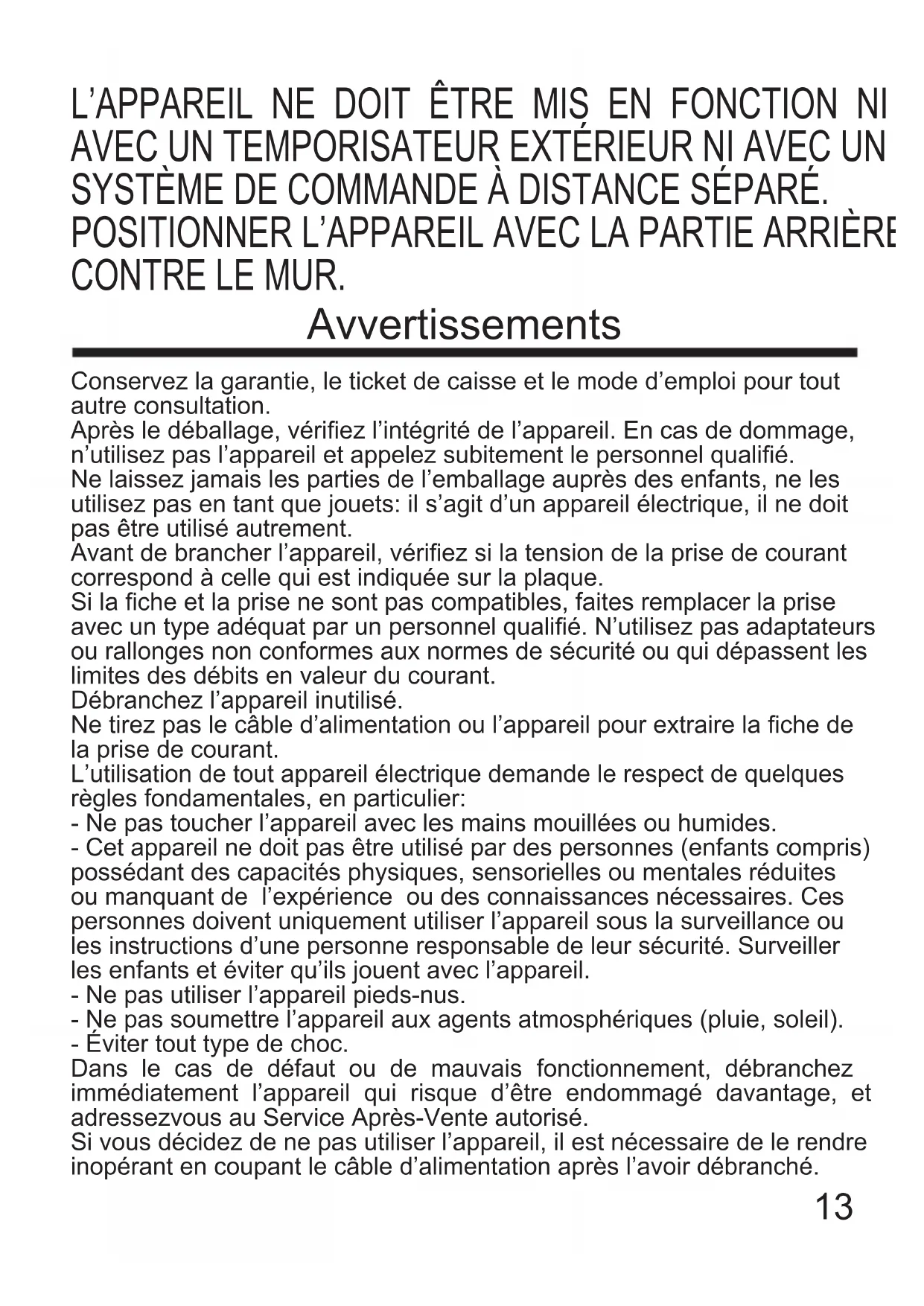 CHAUDES PENDANT L’UTILISATION. 12L’APPAREIL NE DOIT ÊTRE MIS EN FONCTION NI AVEC UN TEMPORISATEUR EXTÉRIEUR NI AVEC UN SYSTÈME DE COMMANDE À DISTANCE SÉPARÉ. POSITIONNER L’APPAREIL AVEC LA PARTIE ARRIÈRE CONTRE LE MUR. Conservez la garantie, le ticket de caisse et le mode d’emploi pour tout autre consultation. Après le déballage, vériez l’intégrité de l’appareil. En cas de dommage, n’utilisez pas l’appareil et appelez subitement le personnel qualié. Ne laissez jamais les parties de l’emballage auprès des enfants, ne les utilisez pas en tant que jouets: il s’agit d’un appareil électrique, il ne doit pas être utilisé autrement. Avant de brancher l’appareil, vériez si la tension de la prise de courant correspond à celle qui est indiquée sur la plaque. Si la che et la prise ne sont pas compatibles, faites remplacer la prise avec un type adéquat par un personnel qualié. N’utilisez pas adaptateurs ou rallonges non conformes aux normes de sécurité ou qui dépassent les limites des débits en valeur du courant. Débranchez l’appareil inutilisé. Ne tirez pas le câble d’alimentation ou l’appareil pour extraire la che de la prise de courant. L’utilisation de tout appareil électrique demande le respect de quelques règles fondamentales, en particulier: - Ne pas toucher l’appareil avec les mains mouillées ou humides. - Cet appareil ne doit pas être utilisé par des personnes (enfants compris) possédant des capacités physiques, sensorielles ou mentales réduites ou manquant de l’expérience ou des connaissances nécessaires. Ces personnes doivent uniquement utiliser l’appareil sous la surveillance ou les instructions d’une personne responsable de leur sécurité. Surveiller les enfants et éviter qu’ils jouent avec l’appareil. - Ne pas utiliser l’appareil pieds-nus. - Ne pas soumettre l’appareil aux agents atmosphériques (pluie, soleil). - Éviter tout type de choc. Dans le cas de défaut ou de mauvais fonctionnement, débranchez immédiatement l’appareil qui risque d’être endommagé davantage, et adressezvous au Service Après-Vente autorisé. Si vous décidez de ne pas utiliser l’appareil, il est nécessaire de le rendre inopérant en coupant le câble d’alimentation après l’avoir débranché. Avvertissements 13L’appareil a été conçu pour fonctionner dans des milieux domestiques; toute autre utilisation est pourtant interdite et dangereuse. N’utilisez pas l’appareil en plein air. Pour des raisons de sécurité, n’ouvrez pas l’appareil. Les surfaces accessibles peuvent atteindre une température élevée durant le fonctionnement de l’appareil. Avant de le remettre dans sa boîte, attendez que le cylindre chauffant ait complètement refroidi. Le cylindre chauffant peut être très chaud et il chauffe l’eau du récipient dans lequel il est immergé. Utilisez un pose-plat pour protéger le plan de travail sur lequel vous souhaitez poser tout récipient utilisé avec l’appareil. Utilisez des pinces à chaque fois que vous souhaitez ajouter quelque chose à l’intérieur du bain d’eau chaude. Faites extrêmement attention lorsque vous déplacez les récipients contenant l’eau chaude. Informations techniques L’appareil a été réalisé conformément à la directive 2014/35/EU et 2014/30/EU. Dates tecniques indiqués sur l’appareil.