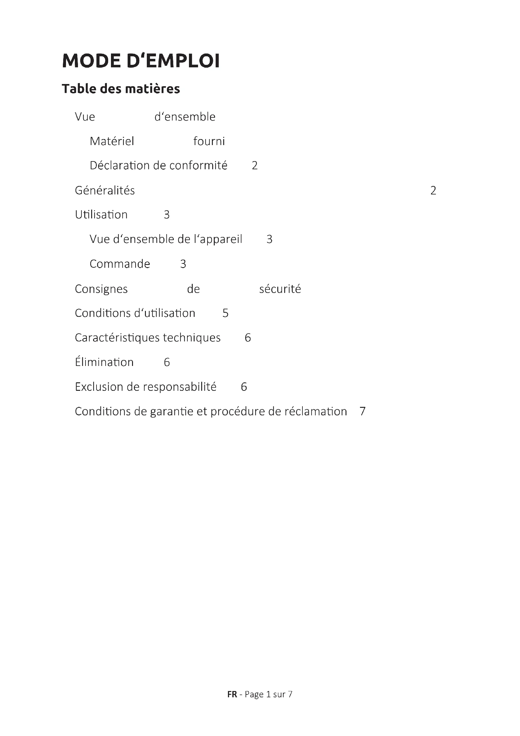 INTENSO INTERNATIONAL GMBH I Service Center (your RMA number) Kopernikusstraße 12-14 I D-49377 Vechta EN - Page 7 of 7MODE D‘EMPLOI FR - Page 1 sur 7 Table des matières Vue d‘ensemble 2 Matériel fourni 2 Déclaraon de conformité 2 Généralités 2 Ulisaon 3 Vue d‘ensemble de l‘appareil 3 Commande 3 Consignes de sécurité 4 Condions d‘ulisaon 5 Caractérisques techniques 6 Éliminaon 6 Exclusion de responsabilité 6 Condions de garane et procédure de réclamaon 7FR - Page 2 sur 7