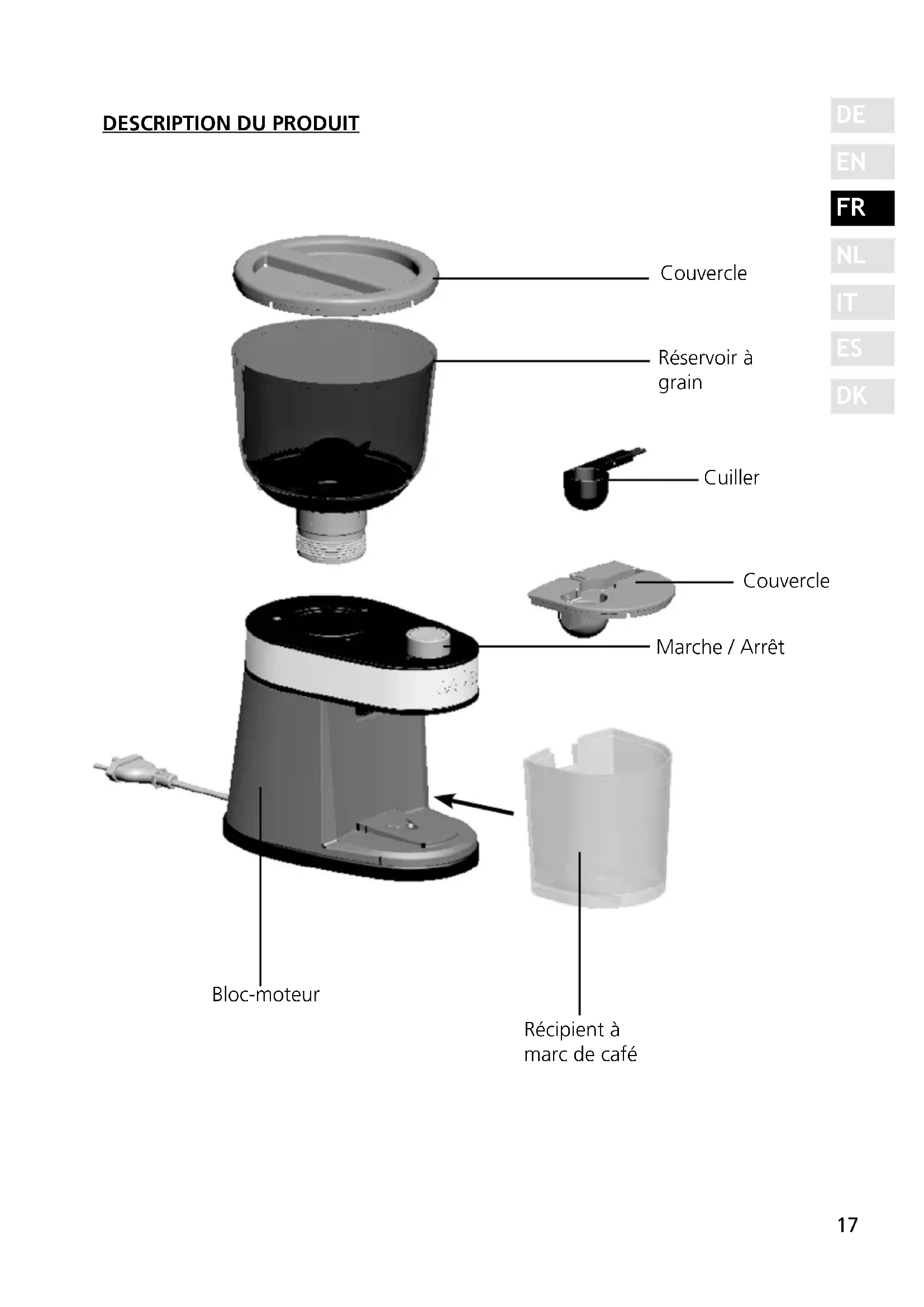 Bloc-moteur Récipient à marc de café Marche / Arrêt Couvercle Cuiller Réservoir à grain Couvercle18 AVANT-PROPOS Chère cliente, cher client, en achetant ce moulin à café, vous avez pris une excellente décision. Vous avez acquis un produit de qualité éprouvé. Nous vous remercions pour votre achat et nous vous souhaitons beaucoup de plai- sir avec votre nouveau moulin à café Graef.