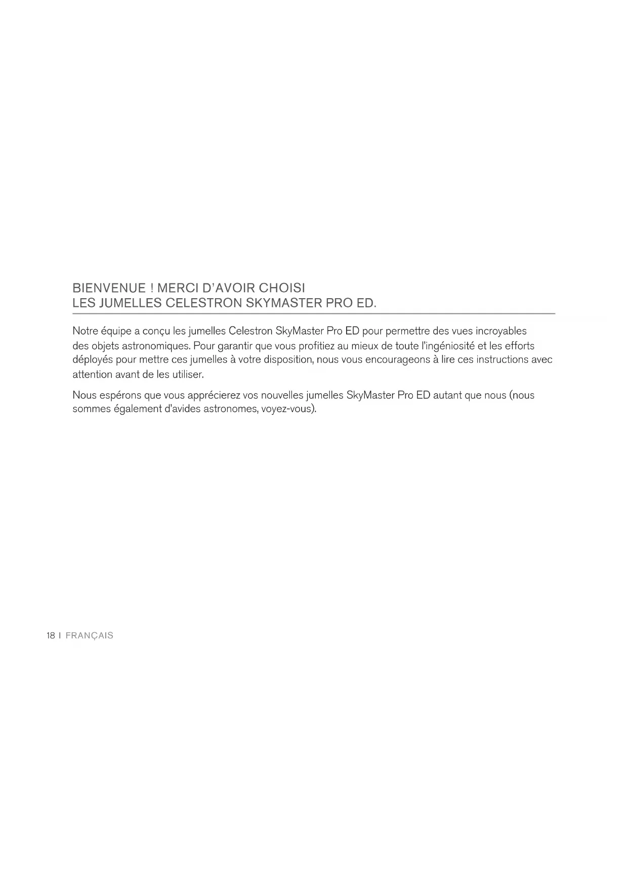 Notre équipe a conçu les jumelles Celestron SkyMaster Pro ED pour permettre des vues incroyables des objets astronomiques. Pour garantir que vous profitiez au mieux de toute l’ingéniosité et les efforts déployés pour mettre ces jumelles à votre disposition, nous vous encourageons à lire ces instructions avec attention avant de les utiliser. Nous espérons que vous apprécierez vos nouvelles jumelles SkyMaster Pro ED autant que nous (nous sommes également d’avides astronomes, voyez-vous).