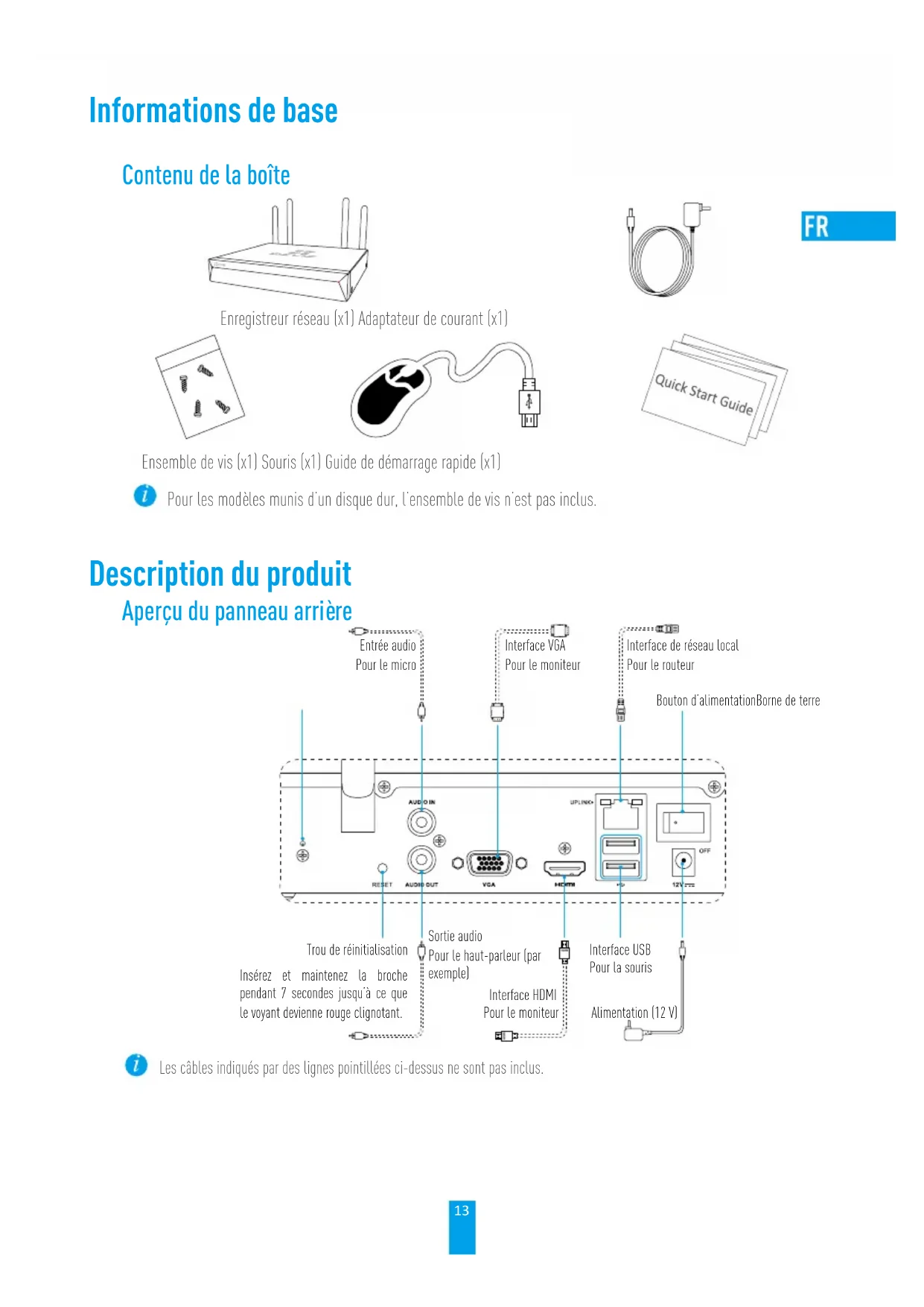 Informations de base Contenu de la boîte Enregistreur réseau (x1) Adaptateur de courant (x1) Ensemble de vis (x1) Souris (x1) Guide de démarrage rapide (x1) Pour les modèles munis d’un disque dur, l’ensemble de vis n’est pas inclus. Description du produit Aperçu du panneau arrière Trou de réinitialisation Sortie audio Pour le haut-parleur (par exemple) Interface VGA Pour le moniteur Interface de réseau local Pour le routeur Interface USB Pour la souris Alimentation (12 V) Interface HDMI Pour le moniteur Entrée audio Pour le micro Bouton d’alimentationBorne de terre Insérez et maintenez la broche pendant 7 secondes jusqu’à ce que le voyant devienne rouge clignotant. Les câbles indiqués par des lignes pointillées ci-dessus ne sont pas inclus.14 Câblage Si vous souhaitez installer le disque dur vous-même, veuillez consulter l’annexe.