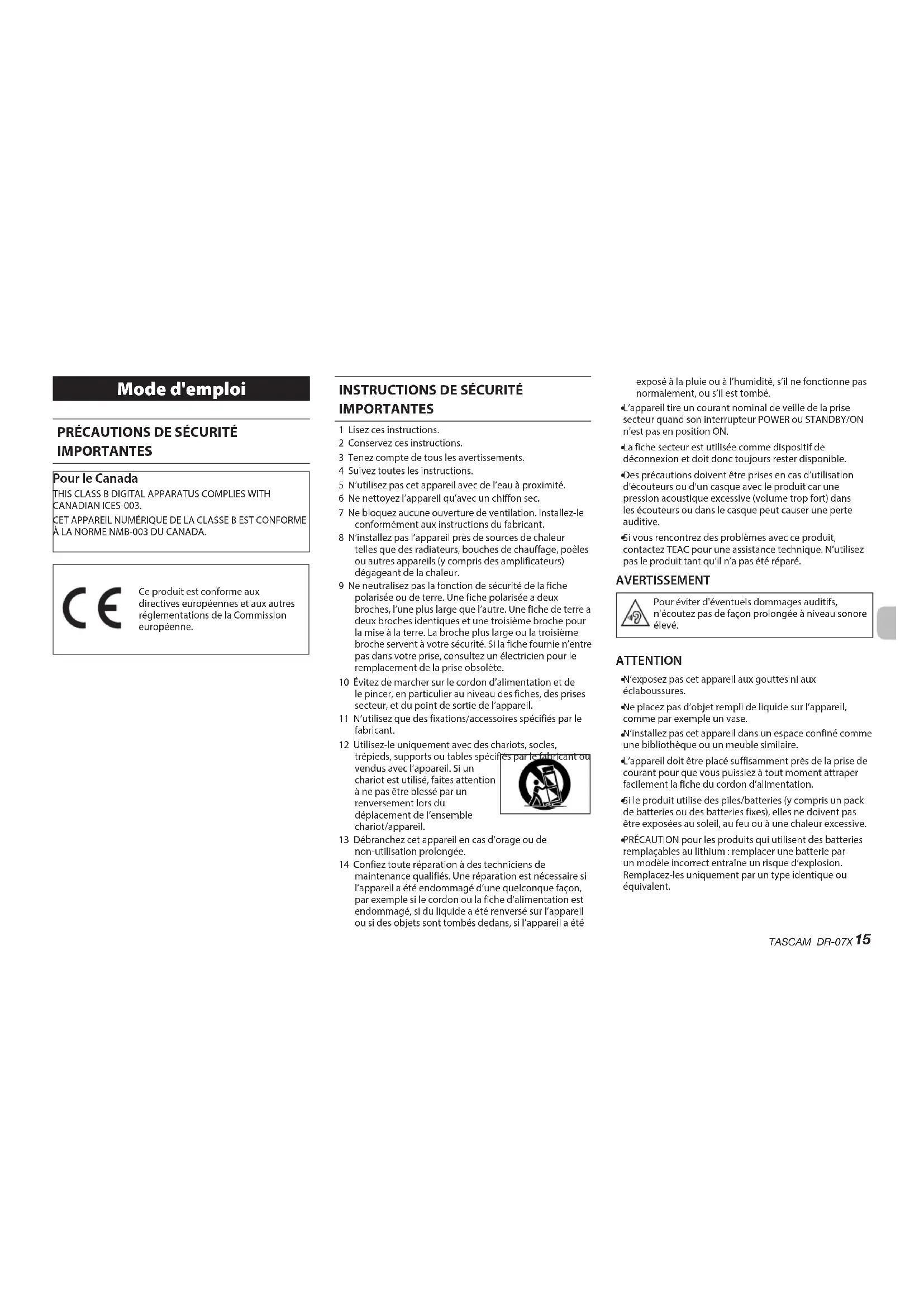 Ne démontez pas une pile. L’acide qu’elle contient peut entraîner des blessures cutanées ou des dommages aux vêtements. Pour les consommateurs européens Mise au rebut des équipements électriques et électroniques (a) Tous les équipements électriques et électroniques doivent être traités séparément de la collecte municipale d’ordures ménagères dans des points de collecte désignés par le gouvernement ou les autorités locales. (b) En vous débarrassant correctement des équipements électriques et électroniques, vous contribuerez à la sauvegarde de précieuses ressources et à la prévention de potentiels effets négatifs sur la santé humaine et l’environnement. (c) Le traitement incorrect des déchets d’équipements électriques et électroniques peut avoir des effets graves sur l’environnement et la santé humaine en raison de la présence de substances dangereuses dans les équipements. (d) Le symbole de poubelle sur roues barrée d’une croix indique que les équipements électriques et électroniques doivent être collectés et traités séparément des déchets ménagers. (e) Des systèmes de retour et de collecte sont disponibles pour l’utilisateur final. Pour des informations plus détaillées sur la mise au rebut des vieux équipements électriques et électroniques, veuillez contacter votre mairie, le service d’ordures ménagères ou le magasin dans lequel vous avez acheté l’équipement. Mise au rebut des piles et/ou accumulateurs (a) Les piles et/ou accumulateurs hors d’usage doivent être traités séparément de la collecte municipale d’ordures ménagères dans des points de collecte désignés par le gouvernement ou les autorités locales. (b) En vous débarrassant correctement des piles et/ou accumulateurs hors d’usage, vous contribuerez à la sauvegarde de précieuses ressources et à la prévention de potentiels effets négatifs sur la santé humaine et l’environnement. (c) Le traitement incorrect des piles et/ou accumulateurs hors d’usage peut avoir des effets graves sur l’environnement et la santé humaine en raison de la présence de substances dangereuses. (d) Le symbole de poubelle sur roues barrée d’une croix indique que les piles et/ou accumulateurs doivent être collectés et traités séparément des déchets ménagers. Si la pile ou l’accumulateur contient plus que les valeurs de plomb (Pb), mercure (Hg) et/ou cadmium (Cd) spécifiées dans la directive sur les piles (2006/66/CE), alors les symboles chimiques de ces éléments seront indiqués sous le symbole de poubelle sur roues barrée d’une croix. (e) Des systèmes de retour et de collecte sont disponibles pour l’utilisateur final. Pour des informations plus détaillées sur la mise au rebut des piles et/ou accumulateurs, veuillez contacter votre mairie, le service d’ordures ménagères ou le magasin dans lequel vous les avez achetés. Pb, Hg, CdTASCAM DR-07X