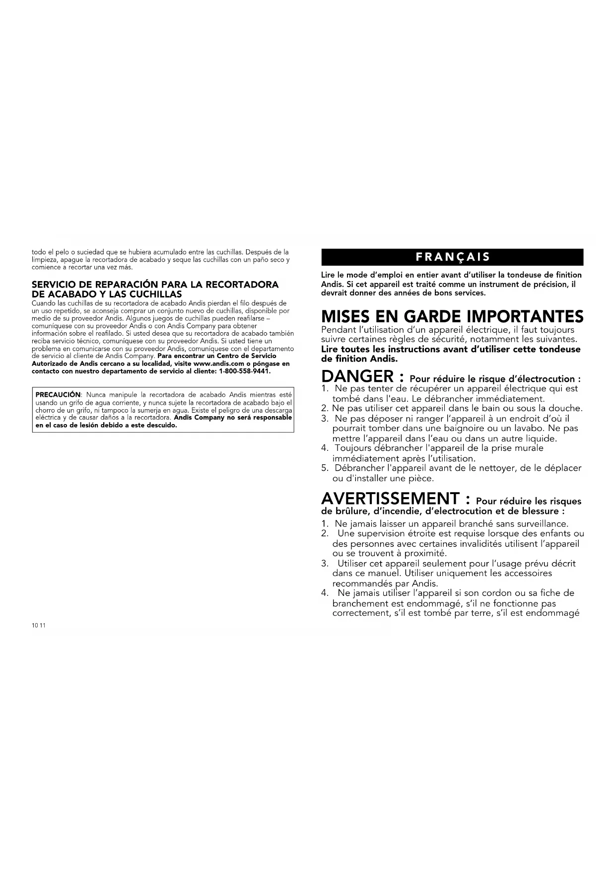 ATTENTION: Ne jamais manipuler la tondeuse de finition Andis tout en réglant le débit d'un robinet d'eau, la tenir sous un fillet d'eau ni la plonger dans l'eau. De telles manœuvres représentent un risque d'électrocution et d'endommagement de la tondeuse de finition. Andis Company ne pourra être tenue responsable de blessures qui font suite à une néligence.