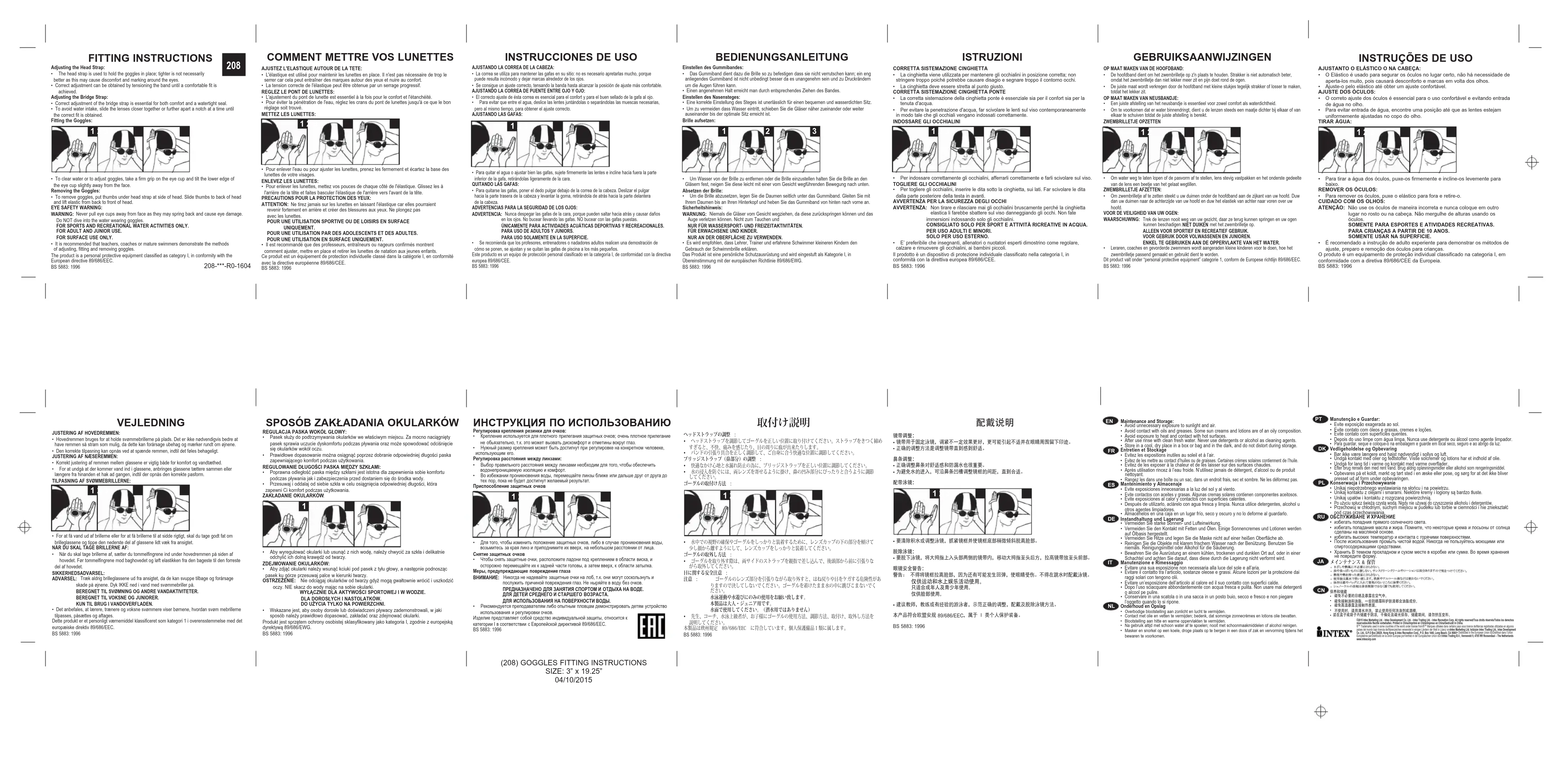 AJUSTEZ L'ELASTIQUE AUTOUR DE LA TETE:• L'élastique est utilisé pour maintenir les lunettes en place. Il n'est pas nécessaire de trop le serrer car cela peut entraîner des marques autour des yeux et nuire au confort.• La tension correcte de l'élastique peut être obtenue par un serrage progressif.REGLEZ LE PONT DE LUNETTES:• L'ajustement du pont de lunette est essentiel à la fois pour le confort et l'étanchéité.• Pour éviter la pénétration de l'eau, réglez les crans du pont de lunettes jusqu'à ce que le bon réglage soit trouvé.METTEZ LES LUNETTES:• Pour enlever l'eau ou pour ajuster les lunettes, prenez les fermement et écartez la base des lunettes de votre visages.ENLEVEZ LES LUNETTES:• Pour enlever les lunettes, mettez vos pouces de chaque côté de l'élastique. Glissez les à l'arrière de la tête et faites basculer l'élastique de l'arrière vers l'avant de la tête.PRECAUTIONS POUR LA PROTECTION DES YEUX:ATTENTION: Ne tirez jamais sur les lunettes en laissant l'élastique car elles pourraient revenir fortement en arrière et créer des blessures aux yeux. Ne plongez pas avec les lunettes. POUR UNE UTILISATION SPORTIVE OU DE LOISIRS EN SURFACE UNIQUEMENT. POUR UNE UTILISATION PAR DES ADOLESCENTS ET DES ADULTES. POUR UNE UTILISATION EN SURFACE UNIQUEMENT.• Il est recommandé que des professeurs, entraîneurs ou nageurs confirmés montrent comment ajuster, mettre en place et retirer les lunettes de natation aux jeunes enfants. Ce produit est un équipement de protection individuelle classé dans la catégorie I, en conformité avec la directive européenne 89/686/CEE.BS 5883: 1996