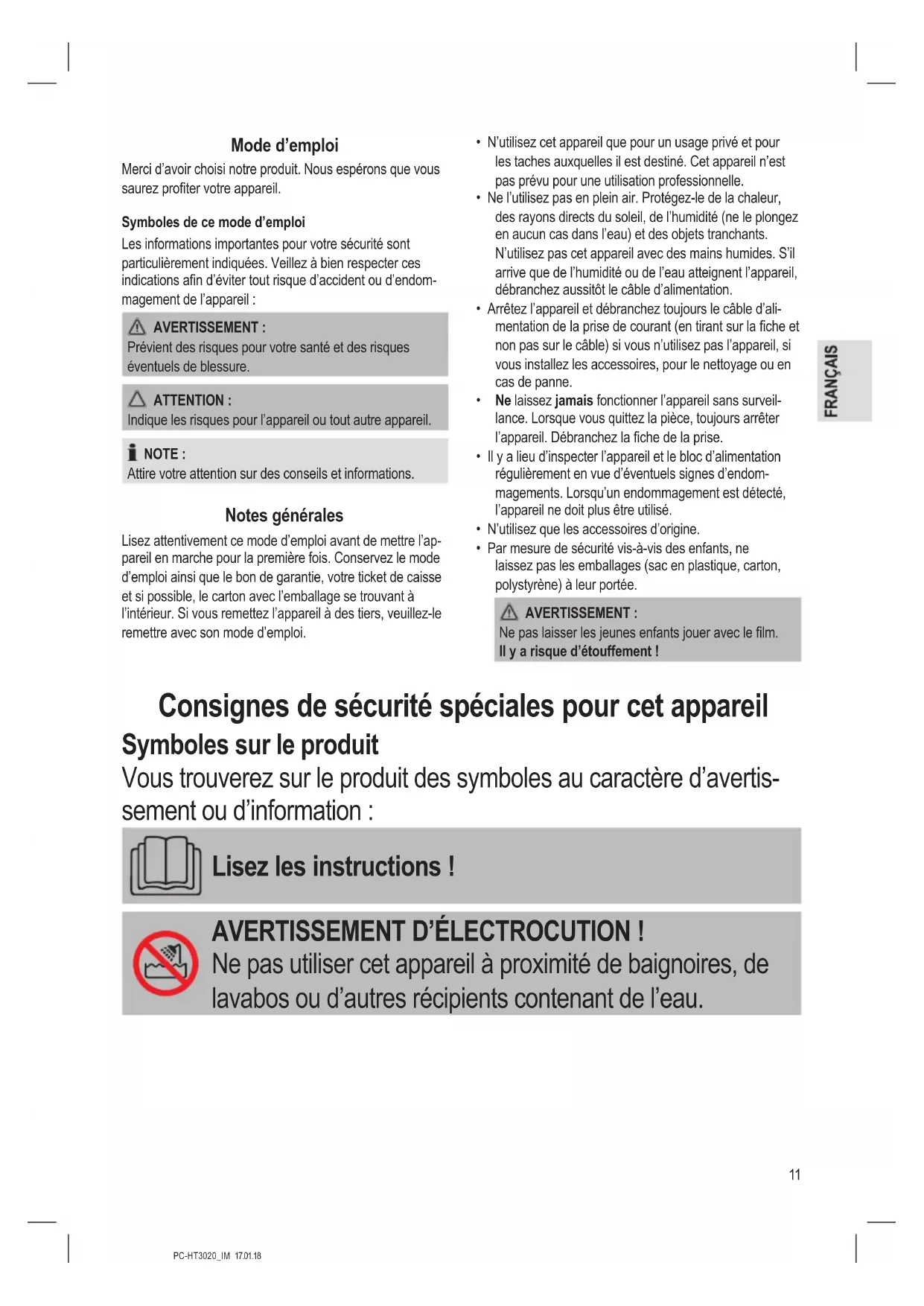 - En aucun cas plonger l’appareil dans de l’eau pour le nettoyer. Vous risqueriez de provoquer une électrocution ou un incendie.14 PC-HT3020_IM 17.01.18 ATTENTION :
